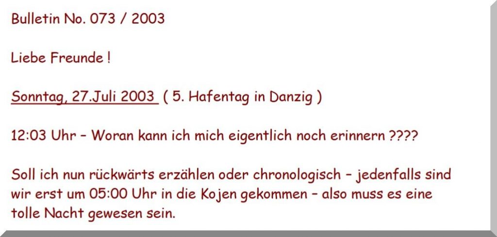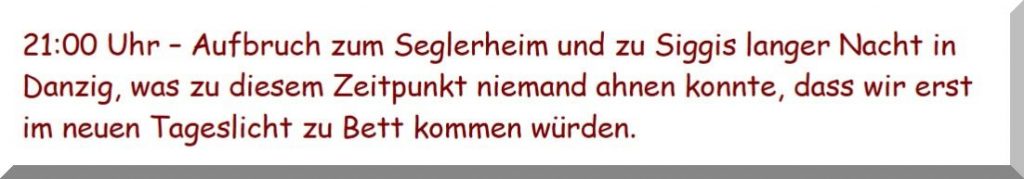 Siggi hatte für unsere Flottillenmitglieder im Danziger Seemannsheim die lange Nacht von Danzig organisiert. Wir waren die einzigen Ausländer bei dieser netten Party. Eine 3-Mann-Kapelle heizte die Stimmung kräftig an, und als wir eintraten wurden sofort Freddy Quinn Lieder angestimmt und die ganze Nacht immer wieder einmal widerholt – eine fetzige Party.