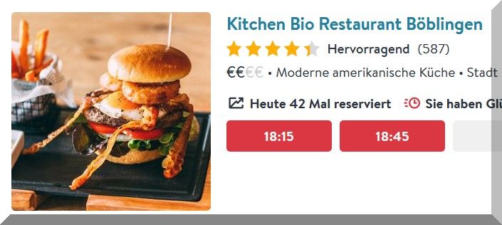 Auf das Motto „Bei Freunden zu Gast“ stimmt das Böblinger Kitchen bereits beim Betreten des Restaurants seine Besucher ein. Gemütliche Sitzgruppen mit Polstersofas und Polsterstühlen auf der einen Seite und kleinere Tischgruppen auf der anderen Seite des Raumes verströmen genau ein stilvolles Ambiente, in dem man auch gerne etwas länger verweilt.