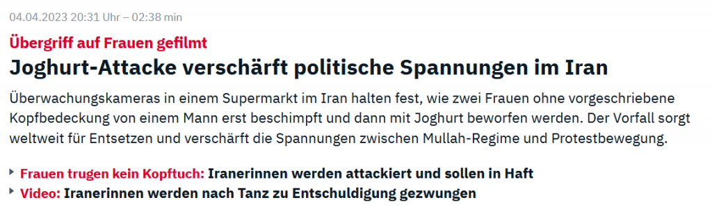 Jetzt werden nicht nur im Iran Frauen ohne korrekt sitzende Kopftücher von Iranern mit Joghurt überschüttet, sondern das findet auch gleich hierzulande Nachahmer, die ihren Übermut an Ordnungshütern auslassen.