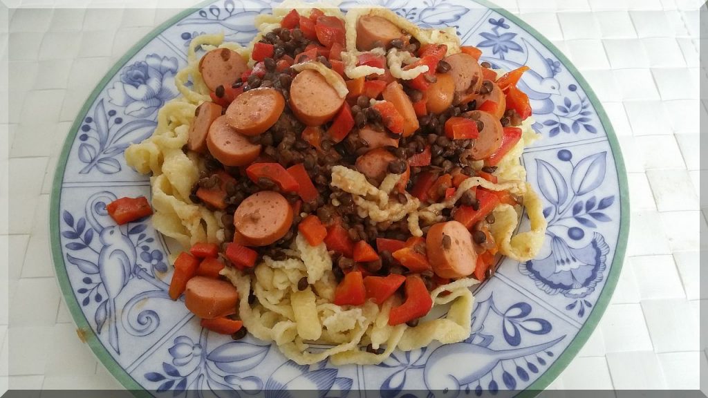 Die roten Paprikawürfel habe ich in der WOK-Pfanne leicht angeröstet, dann die Linsen dazugegeben und schließlich die Würstchenscheiben und 100 ml Sahne untergehoben und schließlich gewürzt mit Salz, Pfeffer, 1 Prise Chilipulver u. 3 EL Condimento Bianco di Modena.