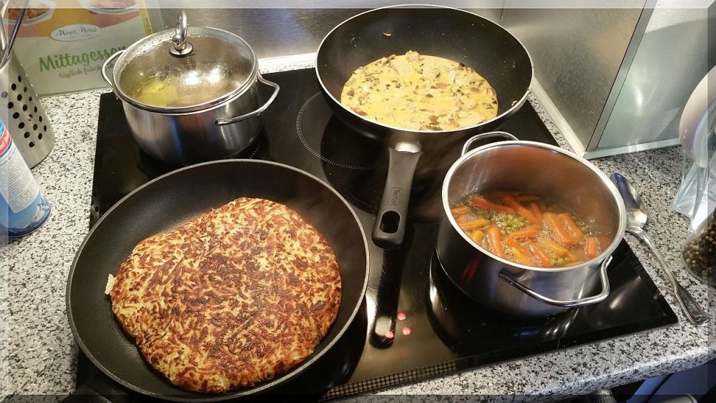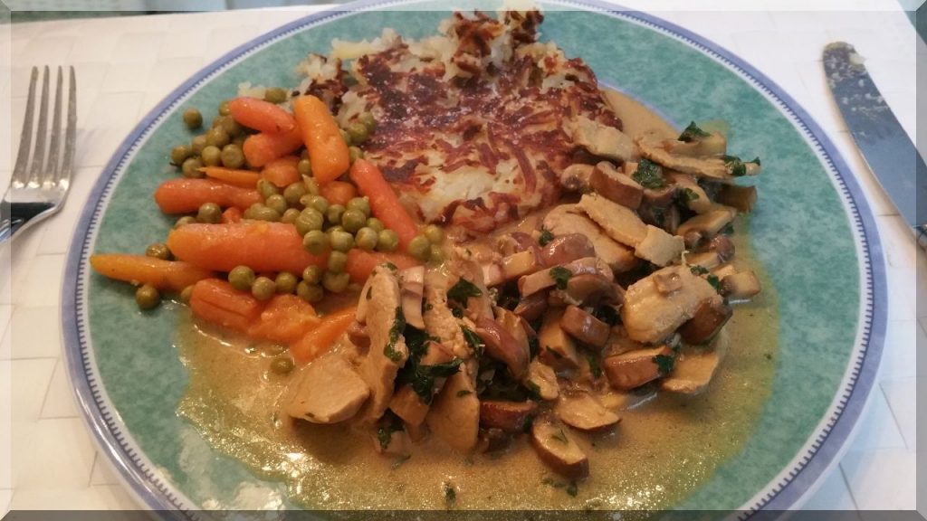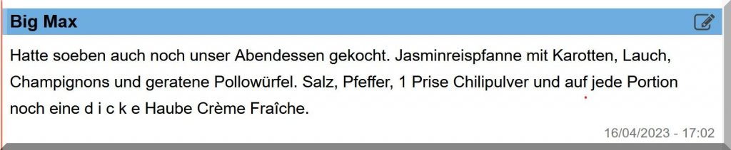 Zum frühen Abendessen hatten wir uns eine Jasmin(!)-Reispfanne mit Gemüse (Champignons, Karotten, Lauch) und braun gebratenen Pollowürfeln. Alles, aber auch alles separat vorbereitet und anschließend mit dem Reis in der Pfanne gemischt und gewürzt (Salz, Pfeffer, 2 Prisen Chilipulver, 2 gepreßte Knoblauchzehen). Dann servieren und für jede Portion 1 kräftige Haube Crème Fraîche obendrauf.