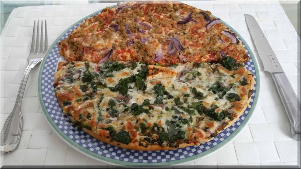 Zum Abensessn gibt es zweierlei Pizzasorten aus unserem Gefrierfach, für jeden je eine Hälfte: