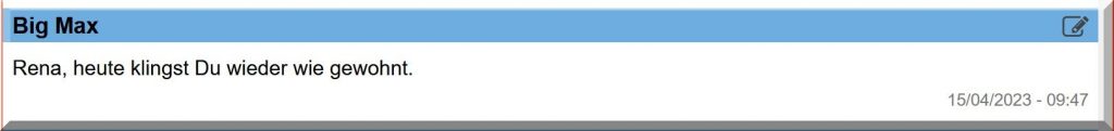 Übrigens ist mir mein gestriges Rehatraining wieder sehr gut bekommen. Ist doch schön, wenn man untrainierte Muskelpartien wieder, unter Anleitung, aktiviert und spürt. Man fühlt sich doch gleich viel lebendiger.