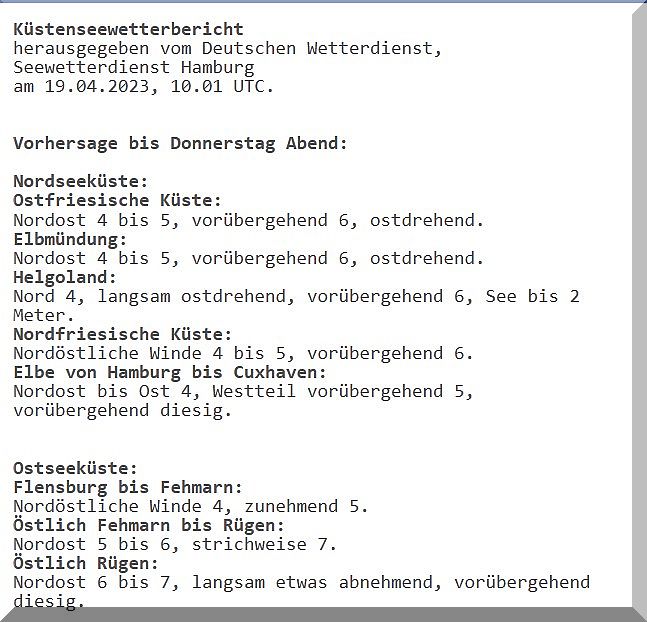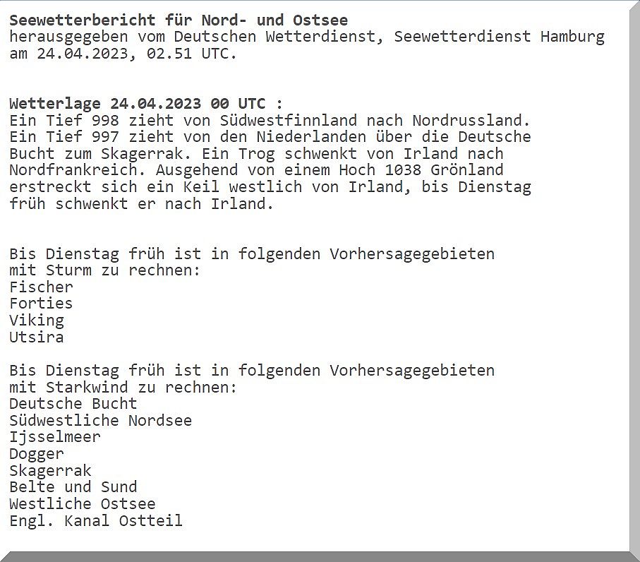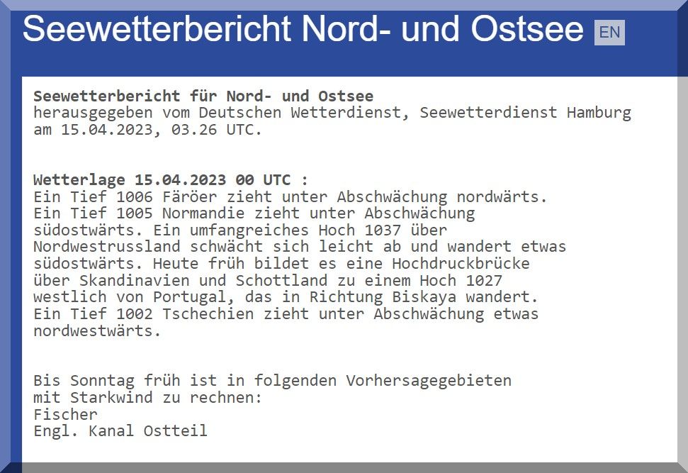 Hier könnt Ihr den LIVESTREAM der über Funk gesendeten Seewetterberichte hören. Dieser Dienst ist nur für DP07- Kunden erreichbar: