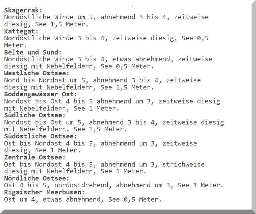 (DWD) WIND: Heute an den Küsten Windböen (Bft 7, bis 60 km/h), exponiert auch einzelne stürmische Böen (Bft 8, bis 70 km/h) aus Nordost bis Ost. Auch sonst abgesehen vom süddeutschen Tiefland wieder auffrischender Wind, aber lediglich in freien Lagen im Westen, sowie allgemein im Bergland Windböen (Bft 7), exponiert stürmische Böen (Bft 8).