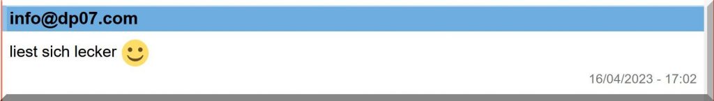 17:10 Uhr – Ich bin mit brennenden Oberschenkeln vom Rehatraining zurück und kann noch den Schluss von DP07 aufnehmen.