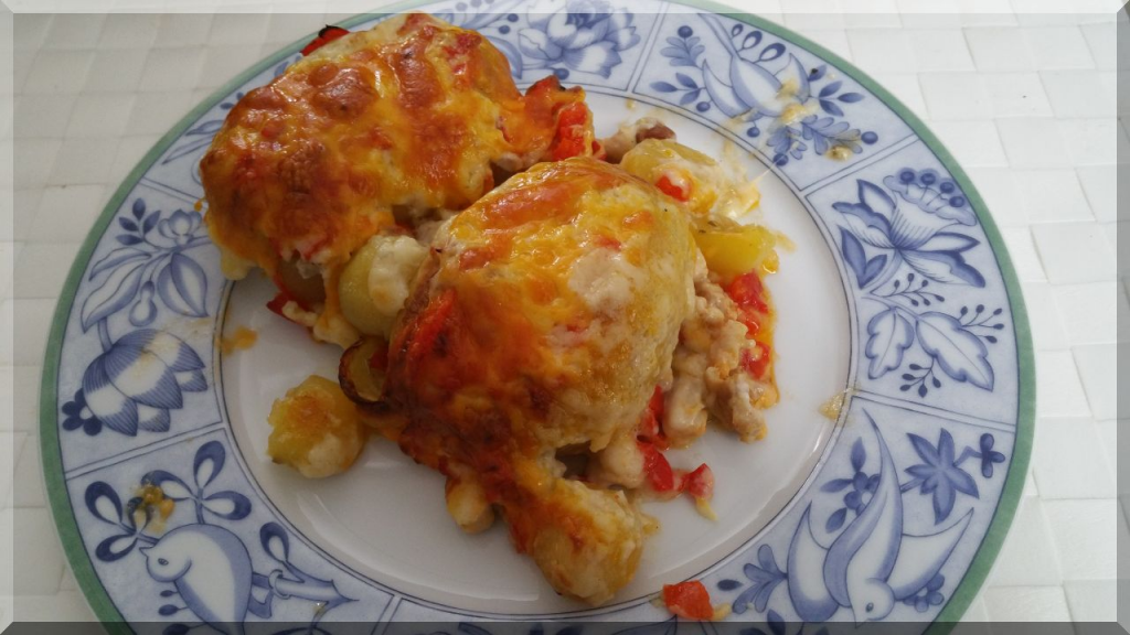 Gestern gab es zum Abendbrot schon wieder mit roter Paprika und Pollo gefüllte große Kartoffeln mit Bechamelsauce und mit Cheddarkäse überbacken – wir mögen dieses Gericht sehr gerne: