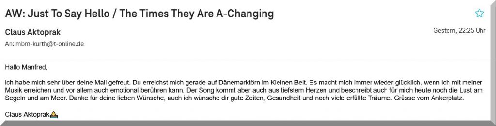 Ich wünsche ihm weiterhin immer eine Handbreit Wasser unter dem Kiel.