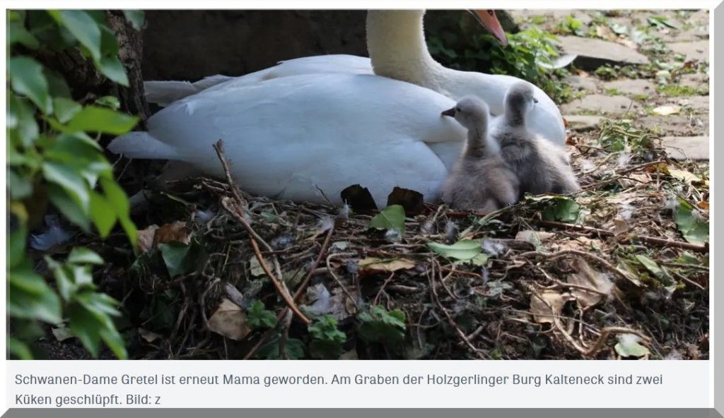 Holzgerlingen. Im Holzgerlinger Schwanen-Märchen an der Burg Kalteneck hat ein neues Kapitel begonnen. Das Schwanen-Paar Hänsel und Gretel, das vor zwei Jahren deutschlandweit berühmt wurde, hat erneut Nachwuchs bekommen. Aus den sechs Eiern, die seit Wochen von der Schwanen-Dame ausgebrütet werden, sind am Schwanen-Mann Hänsel und seine Frau Gretel die ersten beiden Küken geschlüpft.
