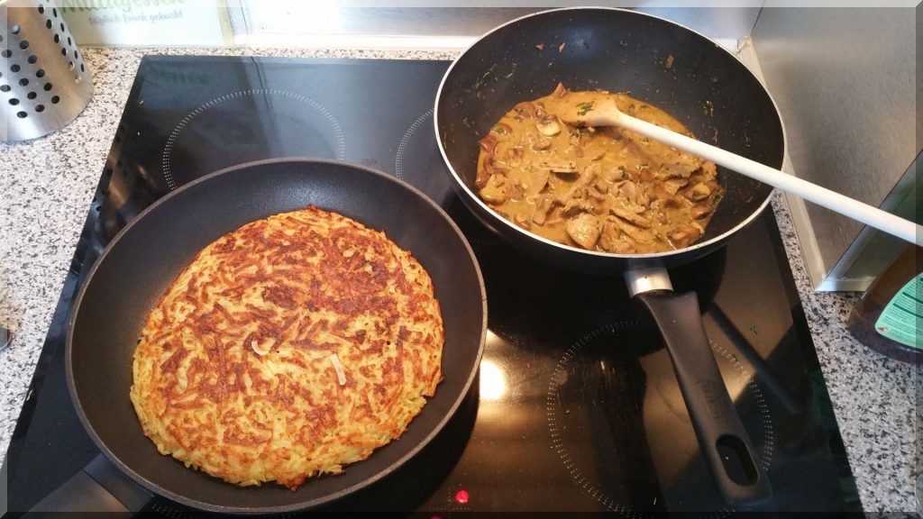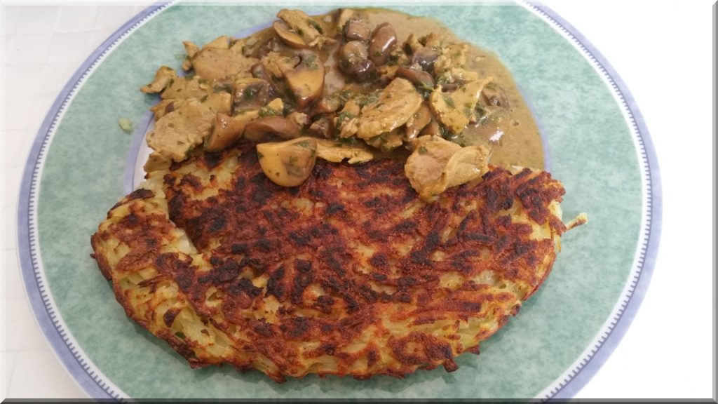 Es gibt Schweizer Rösti von rohen Kartoffeln, gewürzt mit Muskatnuss, Salz & Pfeffer. Dazu Geschnetzeltes vom Schweinefilet und Rahmchampignons: