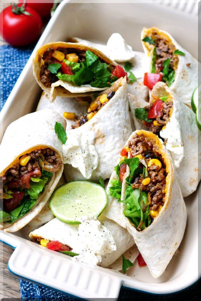 Anschließend die Tomaten mit dem Tomatenmark, Salz und Pfeffer in einem eigenen Topf oder einer Schüssel verrühren und abschmecken. Dann geht es ans Belegen: Hierfür streicht man etwas Soße auf die Tortillas, verteilt dann das Hackfleisch darauf und bestreut das Ganze mit etwas Käse. Dann die Tortillas einrollen und in eine Backform legen. Die übrige Tomatensauce darüber geben und den Stapel mit dem restlichen Käse bestreuen. Zuletzt 15 bis 20 Minuten im Ofen goldbraun backen.