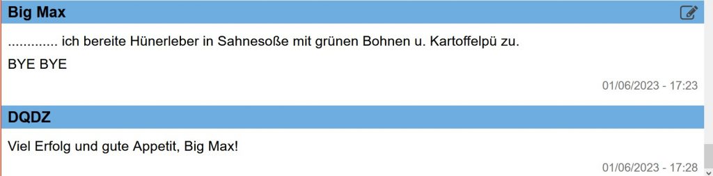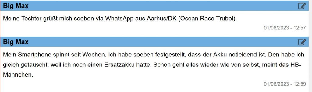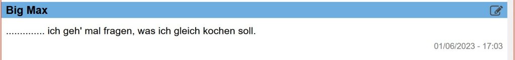 13:15 Uhr – Habe noch ein Telefonat mit meinem Sohn, der mich auf einige Dinge meiner WordPress-Homepage hinweist. Wir diskutieren das und kommen zu einer übereinstimmenden Vorgehensweise, die wir gleich einmal testweise ausführen.