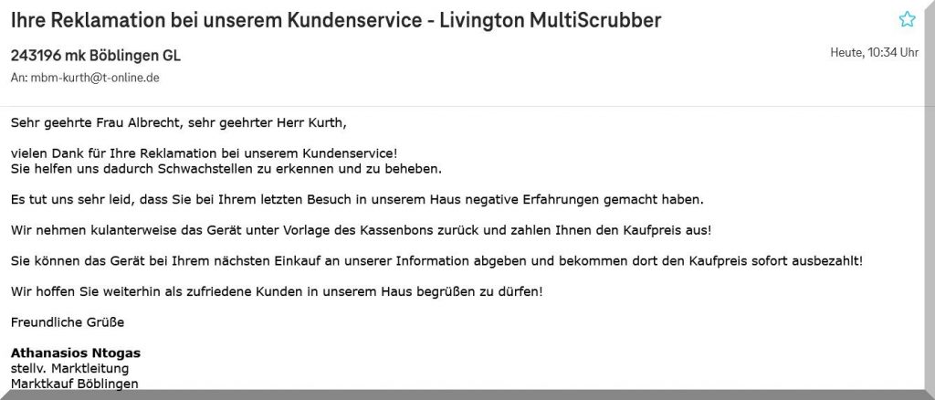 Mit Livington haben wir beim Kauf nicht wissentlich einen Kaufvertrag abgeschlossen, sondern Marktkauf ist unser Verkäufer und deshalb auch unser Vertragspartner.