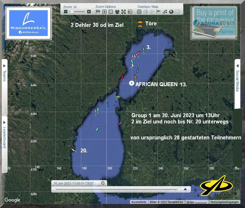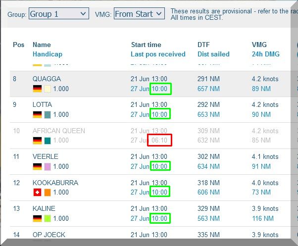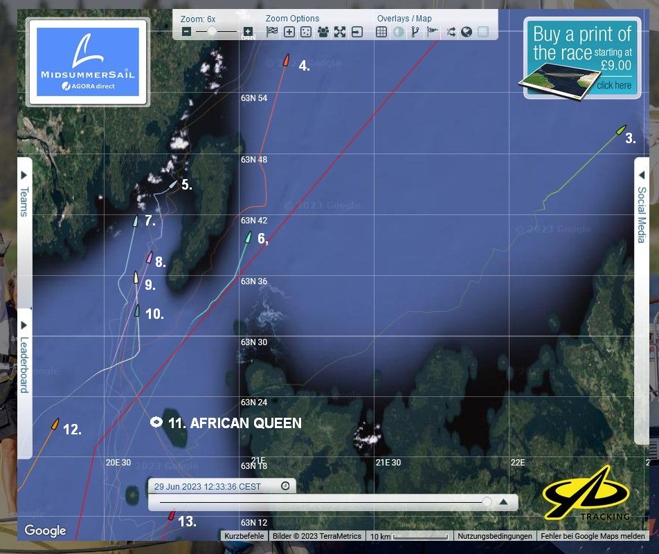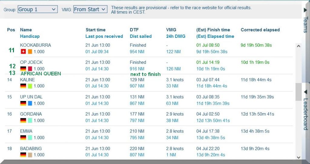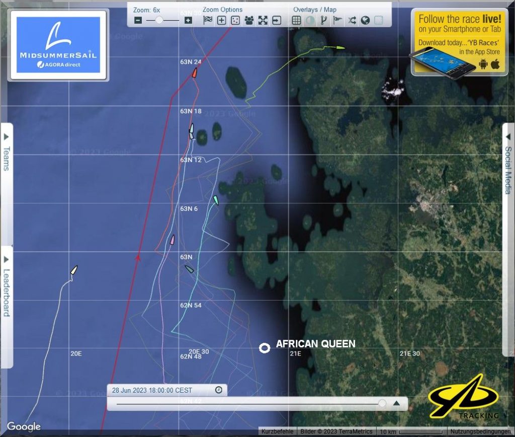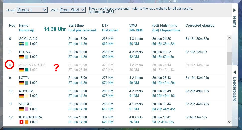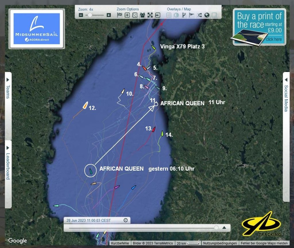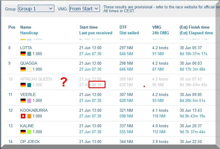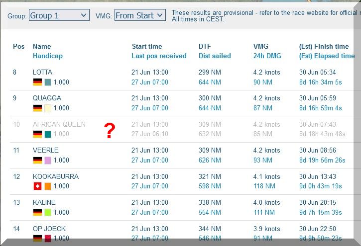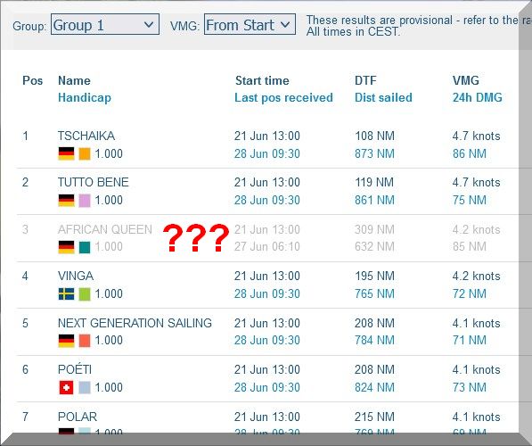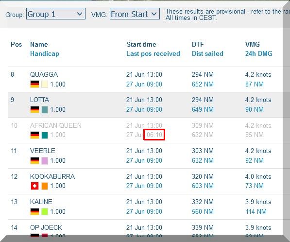 12:35 Uhr – Ich schaue nochmals in MidsummerSail rein und entdecke, dass jetzt die African Queen auf Platz 8 geführt wird, obwohl die Yachten auf den Plätzen 9, 10 u. 11 offensichtlich vor ihr liegen.