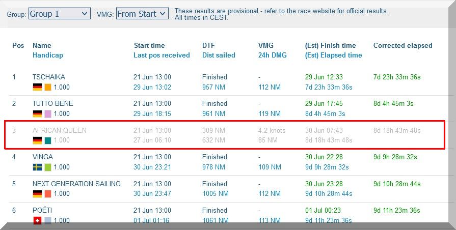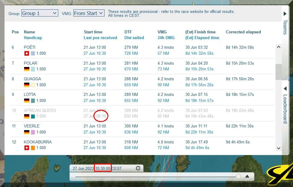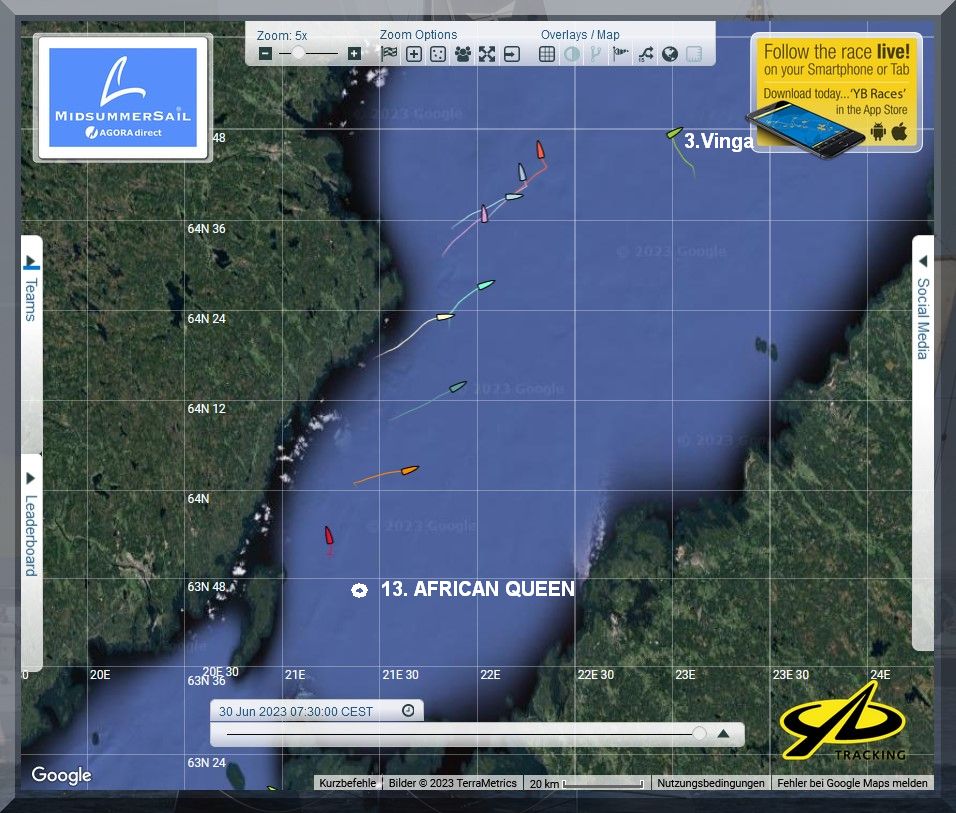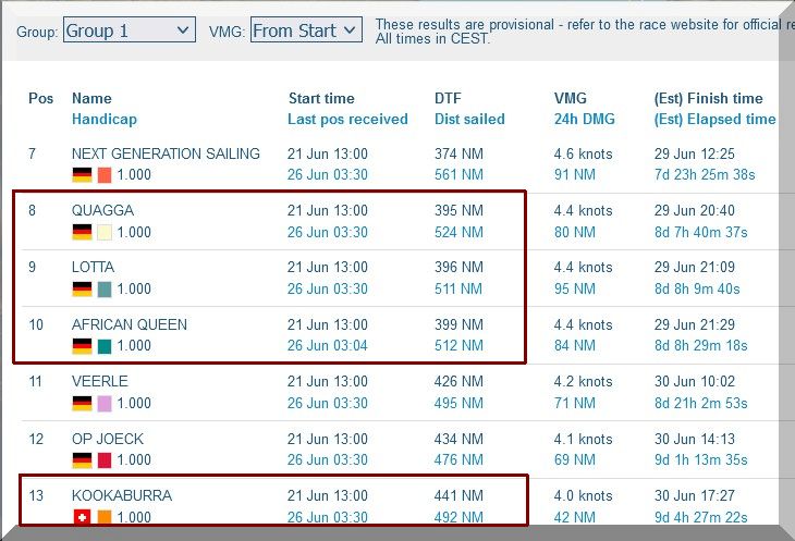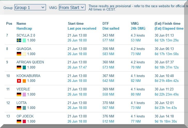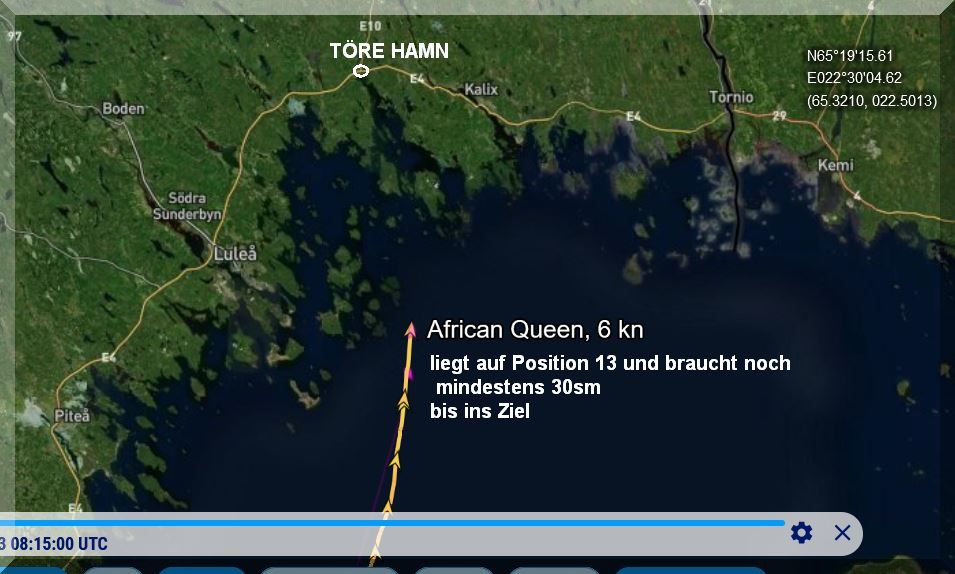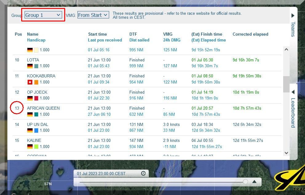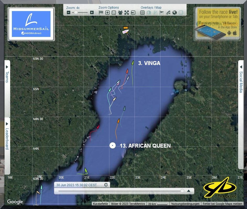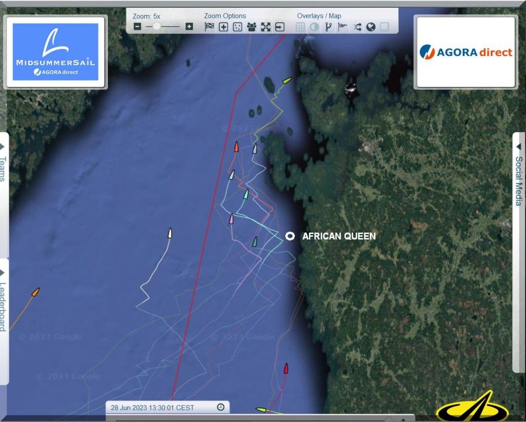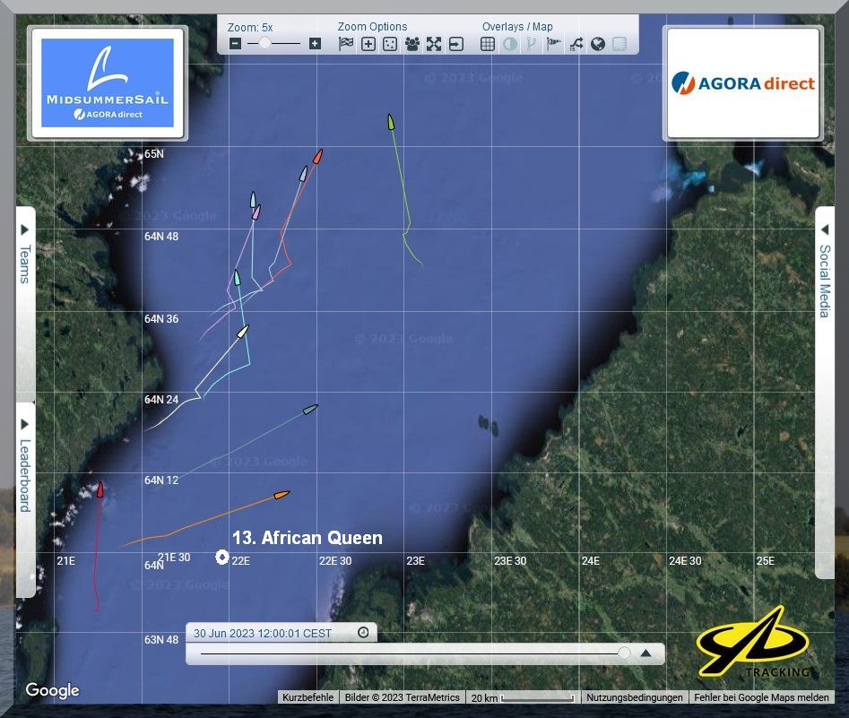 12:35 Uhr – Ich schaue nochmals in MidsummerSail rein und entdecke, dass jetzt die African Queen auf Platz 8 geführt wird, obwohl die Yachten auf den Plätzen 9, 10 u. 11 offensichtlich vor ihr liegen.