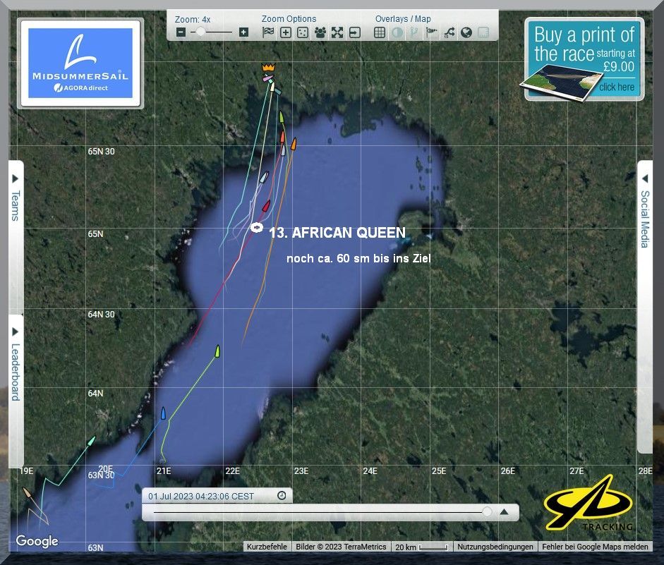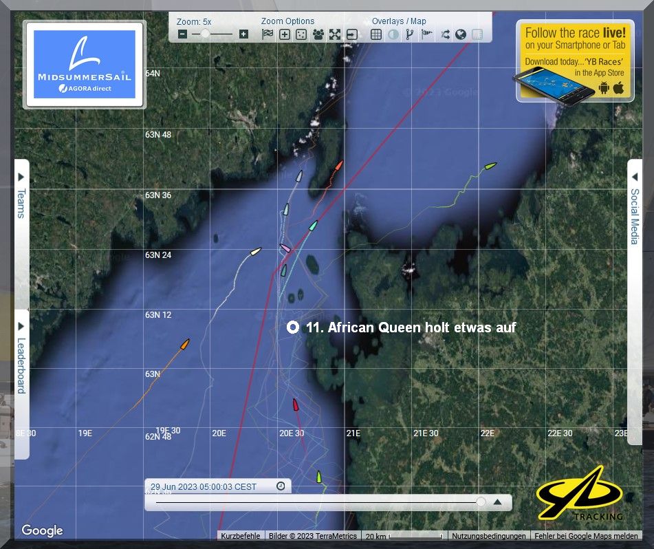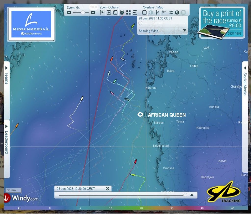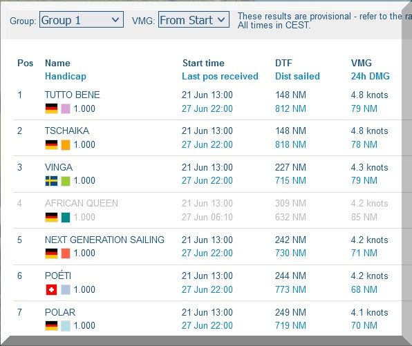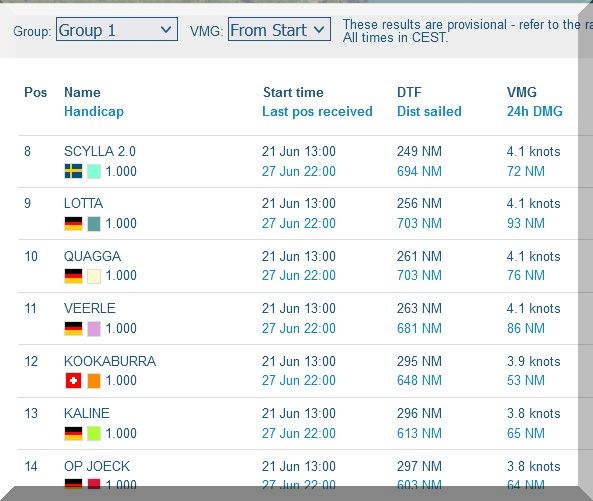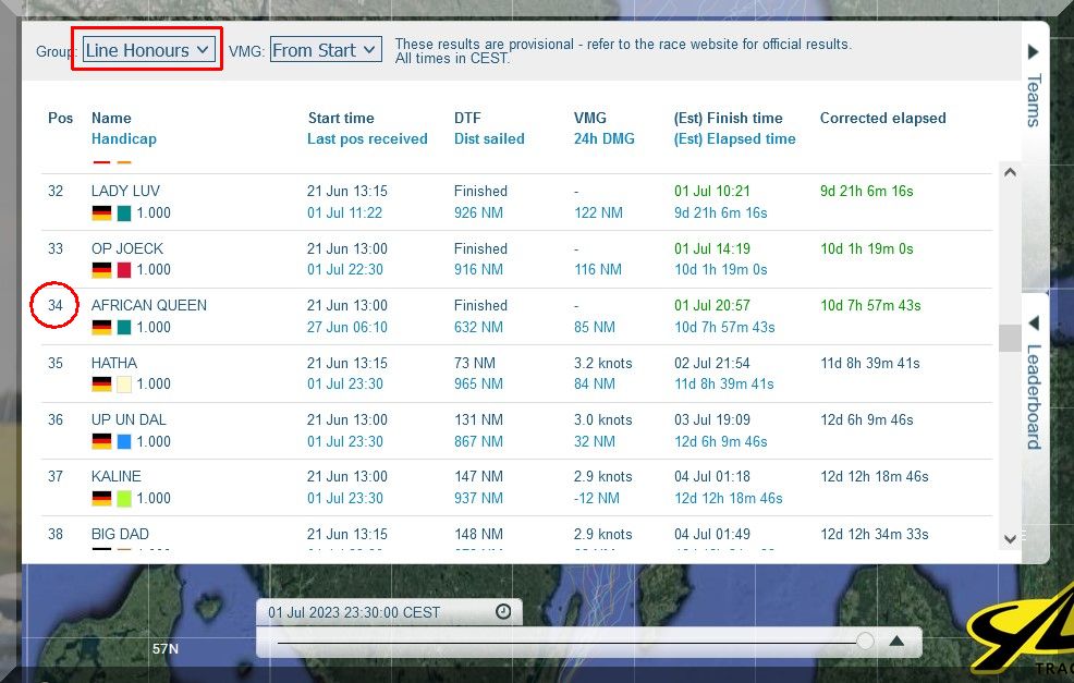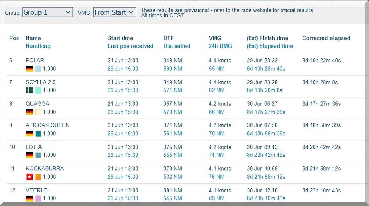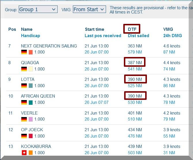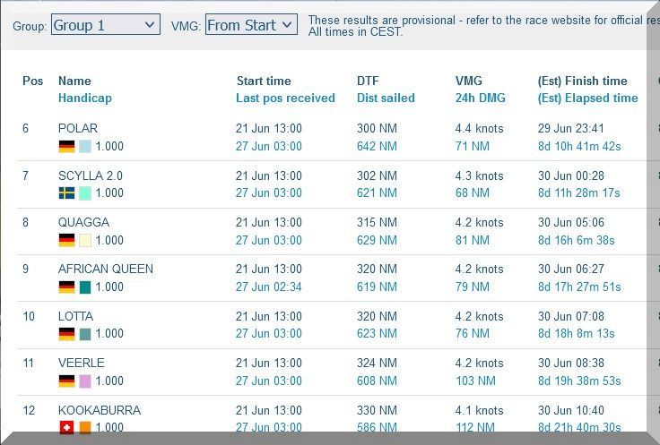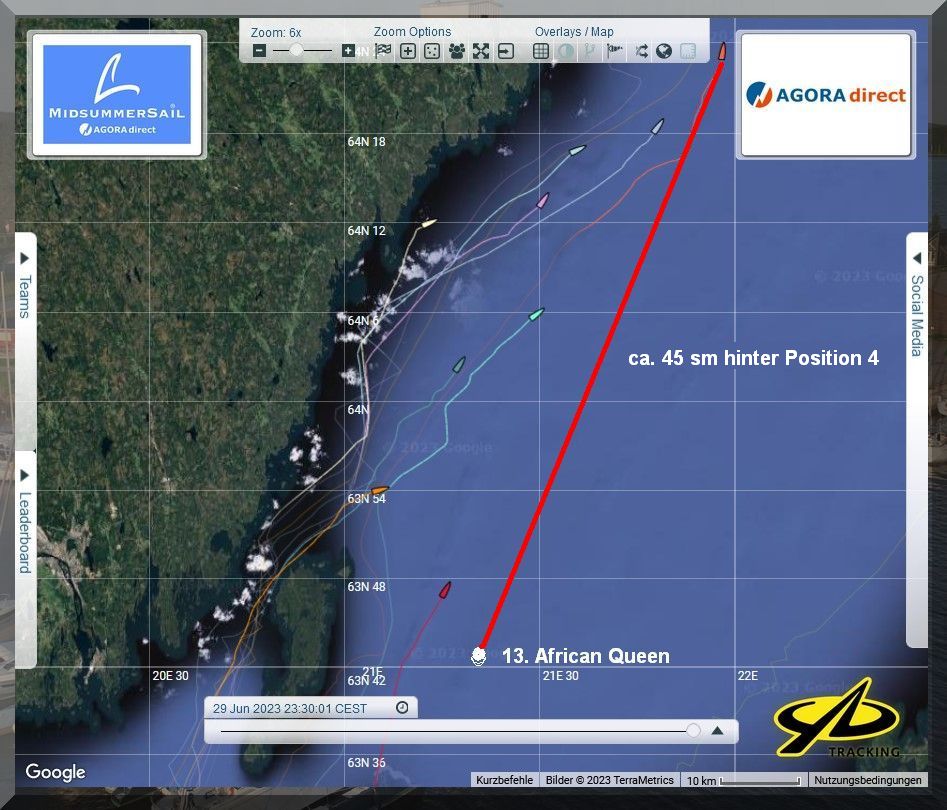 12:35 Uhr – Ich schaue nochmals in MidsummerSail rein und entdecke, dass jetzt die African Queen auf Platz 8 geführt wird, obwohl die Yachten auf den Plätzen 9, 10 u. 11 offensichtlich vor ihr liegen.
