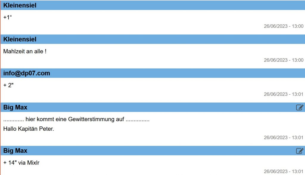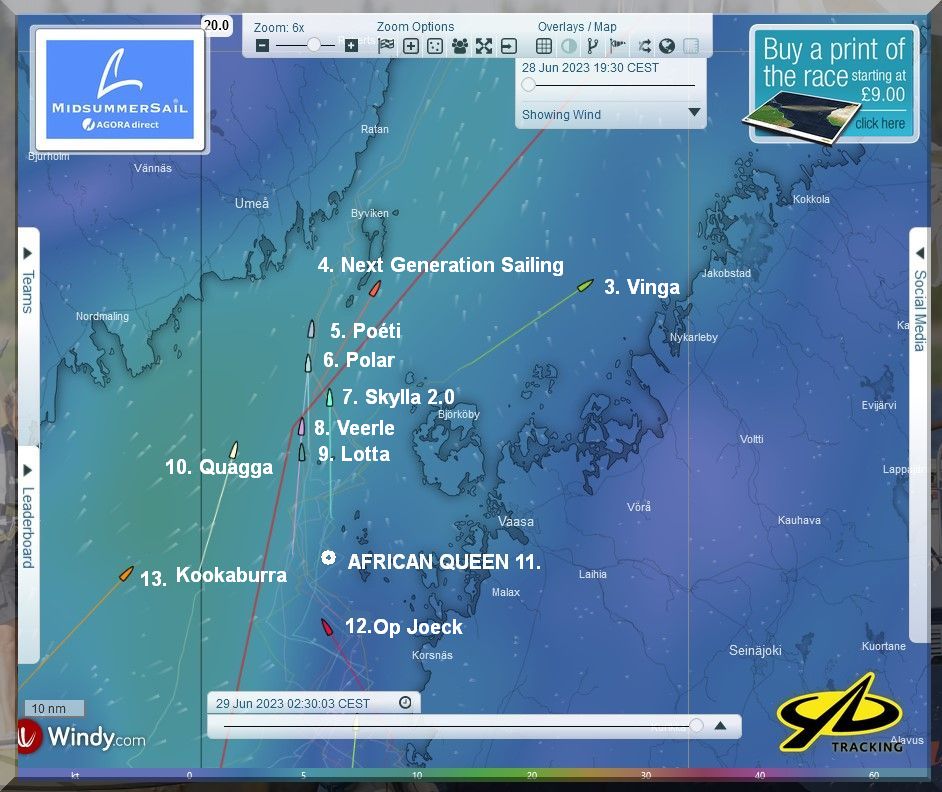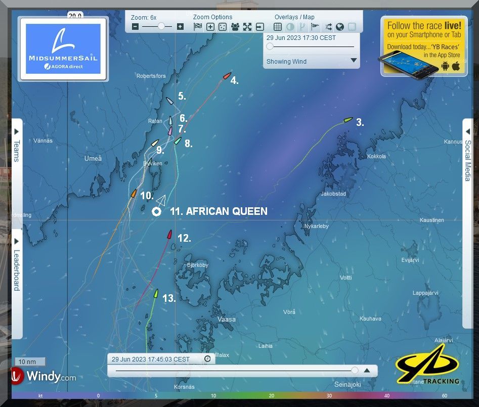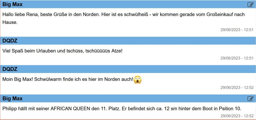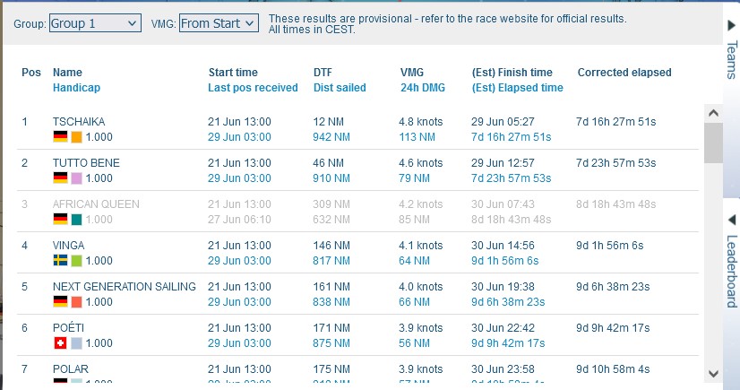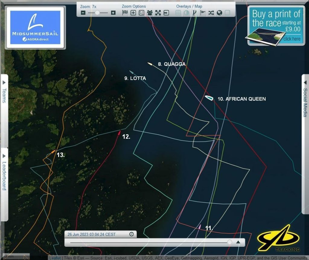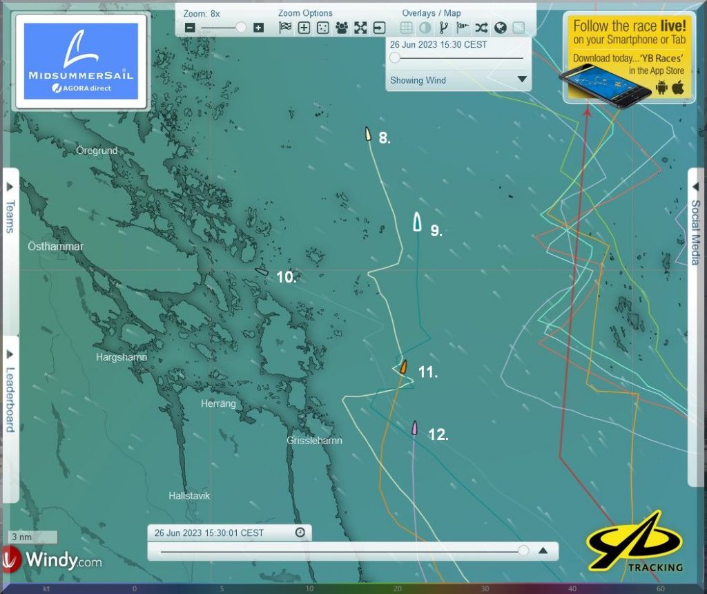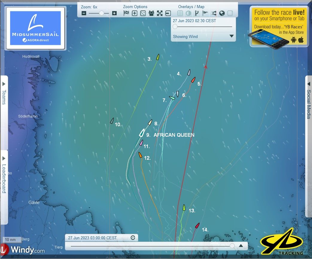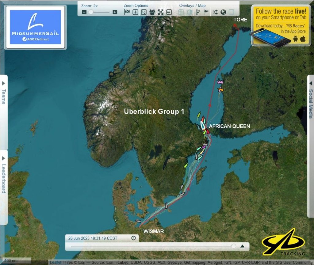 12:35 Uhr – Ich schaue nochmals in MidsummerSail rein und entdecke, dass jetzt die African Queen auf Platz 8 geführt wird, obwohl die Yachten auf den Plätzen 9, 10 u. 11 offensichtlich vor ihr liegen.