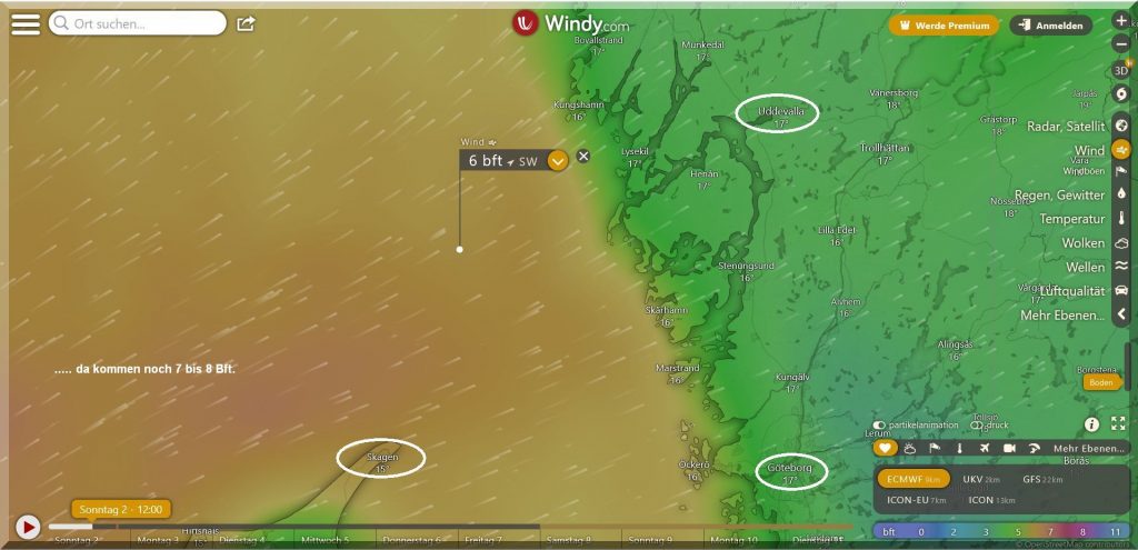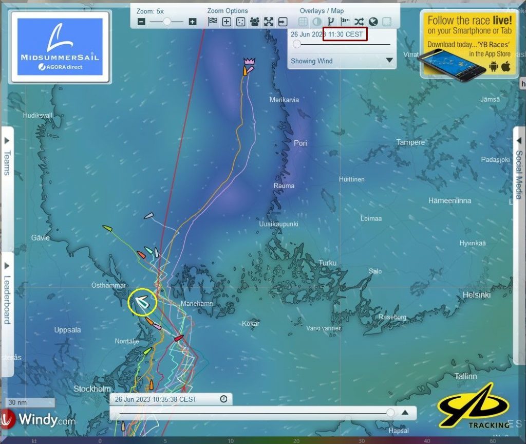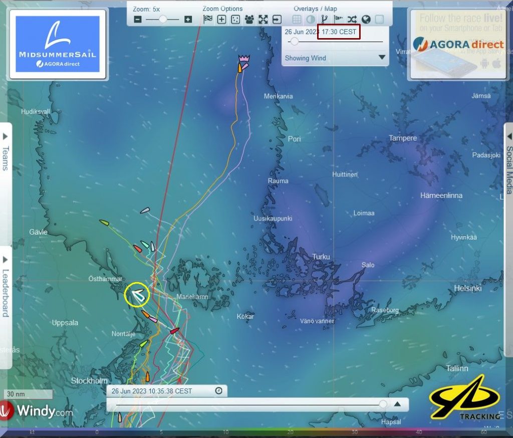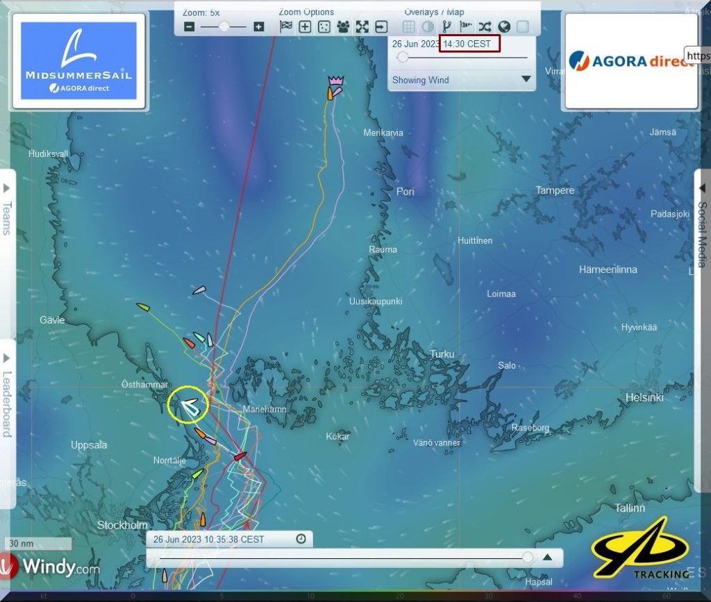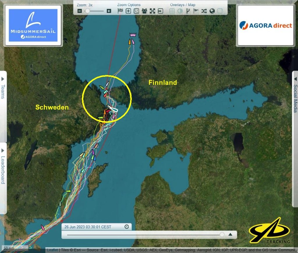 Der Nordwind wird im Laufe des Vormittags wohl eine östliche Komponente bekommen. Dann können die Yachten auf Habwindkurs gehen und Speed machen und durch das „Nadelöhr“ zwischen Stockholmer Schärengürtel und den Ålandinseln/F in den Bottnischen Meerbusen einaufen.
