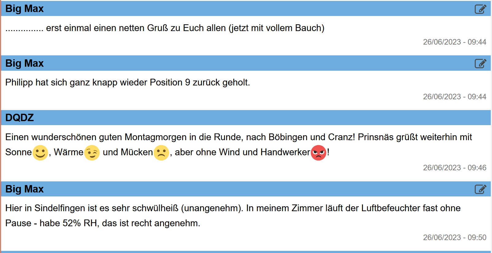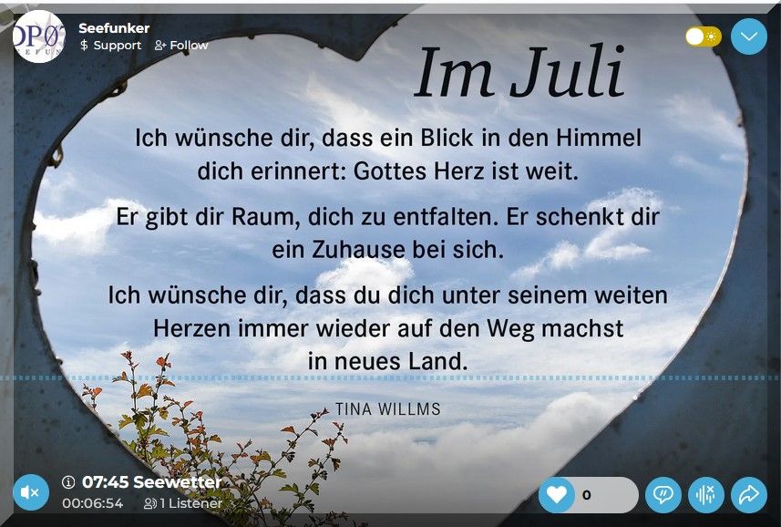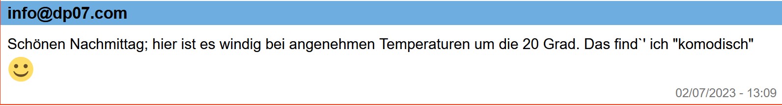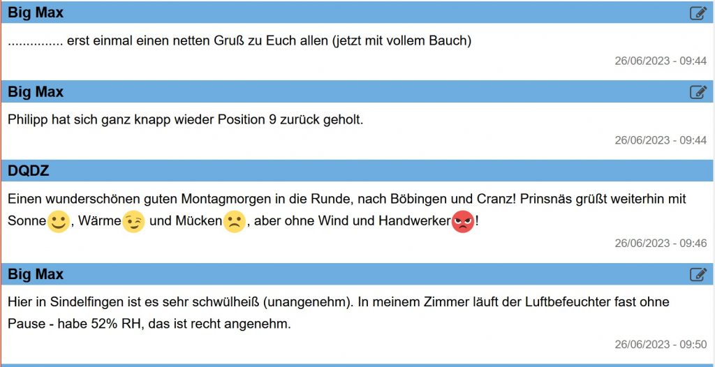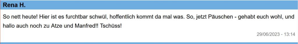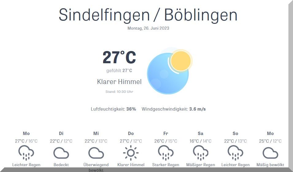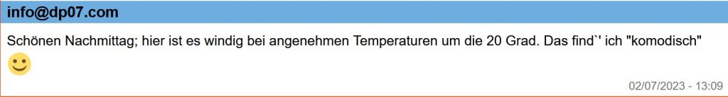13:00 Uhr – Soeben haben Steffi und ich unseren Montagsspaziergang profilaktisch auf Mittwoch verschoben, da soll es dann etwas kühler sein.