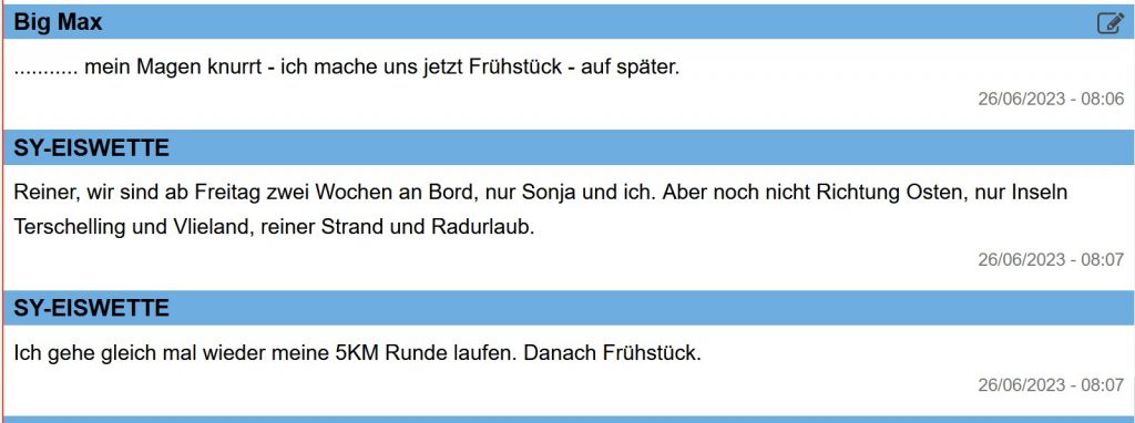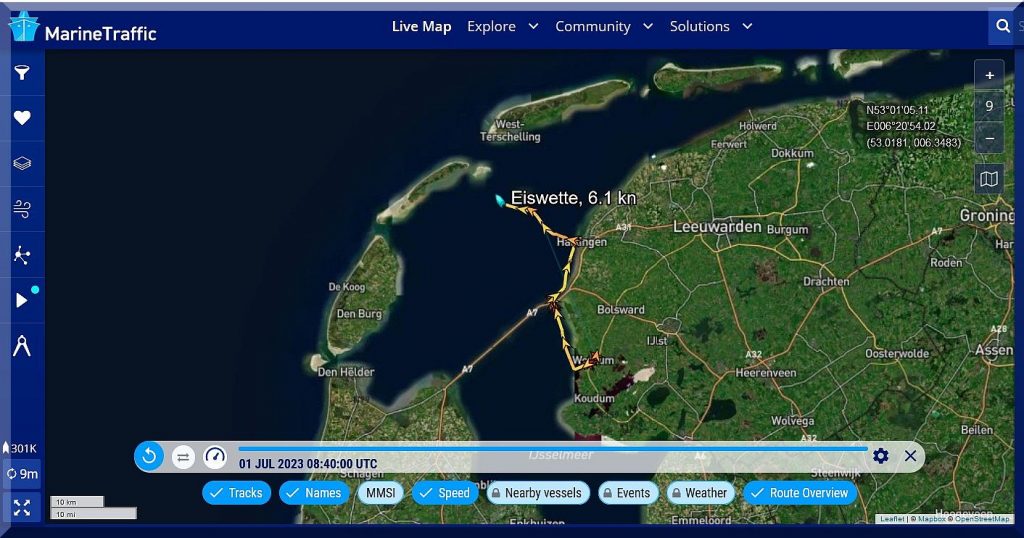 Jan hat mit seiner SY EISWETTE Workum um 13:50 Uhr verlassen und geht gerade um ca. 16 Uhr durch die Schleuse Kornwerderzand zur Nordsee. Er und Sonja wollen auf den Inseln im Wattenmeer etwas Sommer- und Badeurlaub machen: