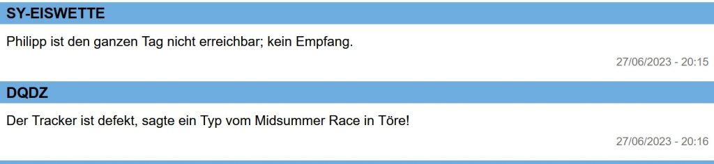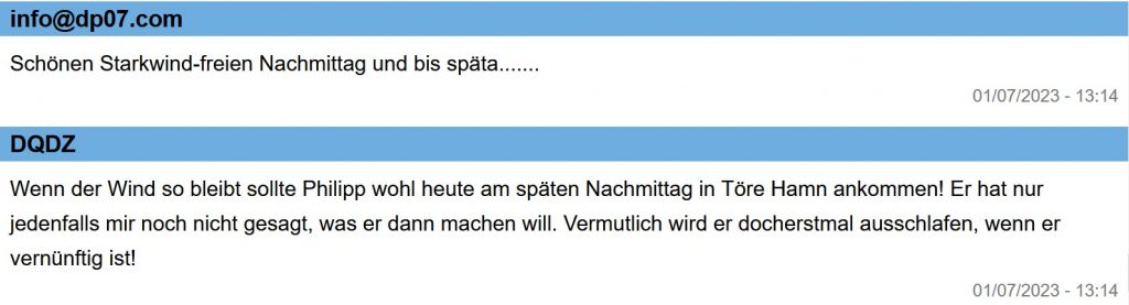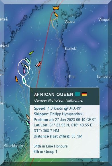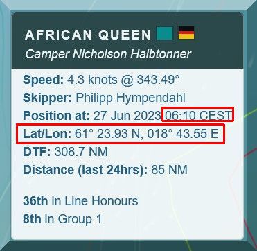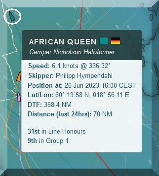 In der Abendsendung von DP07 gab es noch einmal Infos zu AFRICAN QUEEN. Klaus, alias Diogenes ist einfach nach Töre zur Regattaleitung gefahren (17 Km) und hat nachgefragt. Man bestätigte ihm, dass am Tracker von Philipp ein Defekt vorläge: