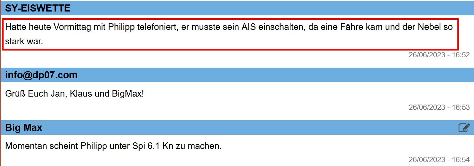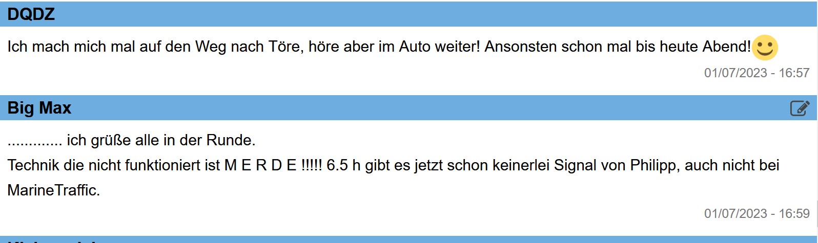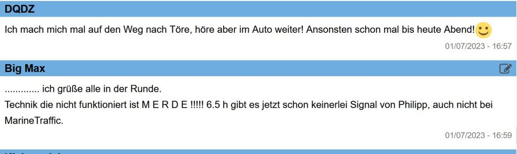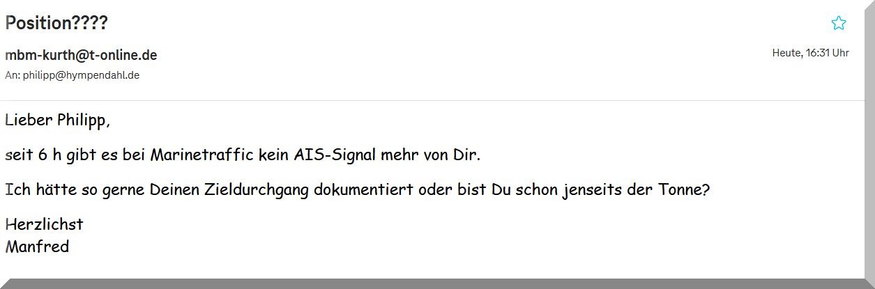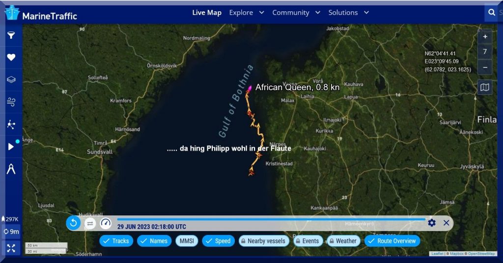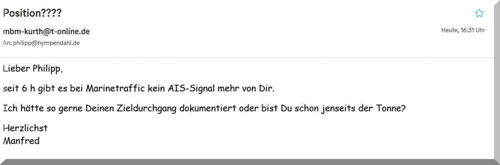 Von Philipp und AFRICAN QUEEN habe ich seit 3 h keine aktuelle Position mehr, auf MarineTraffic. Hat Philipp sein AIS ausgeschaltet?