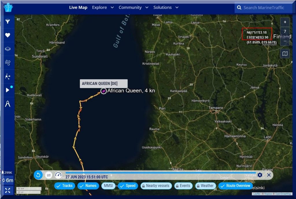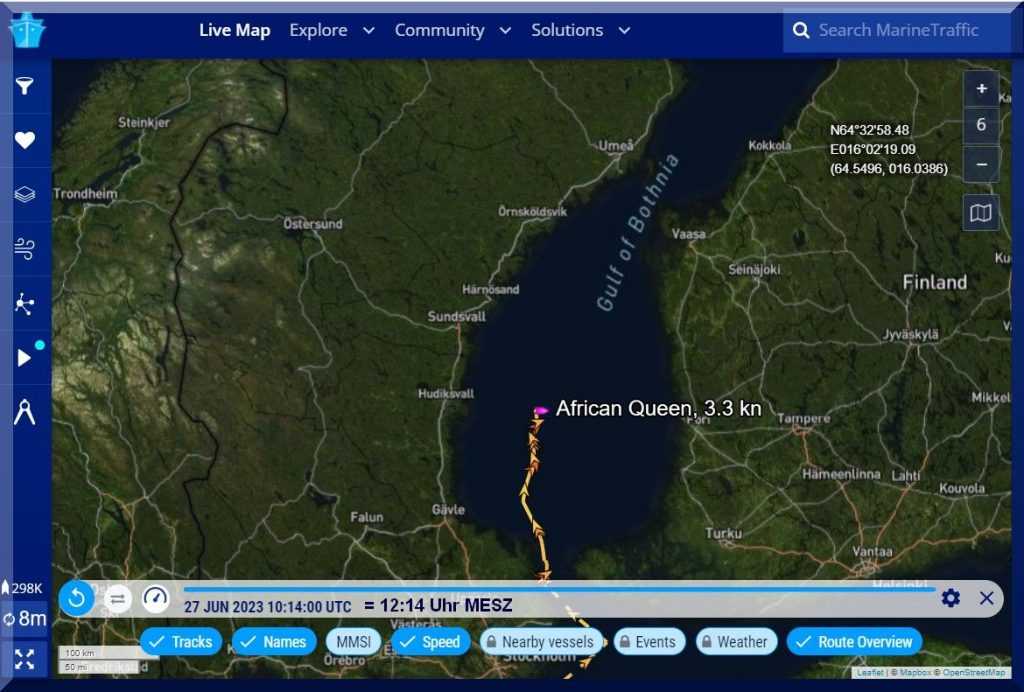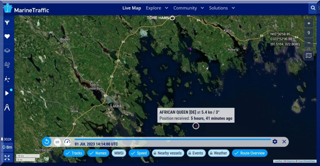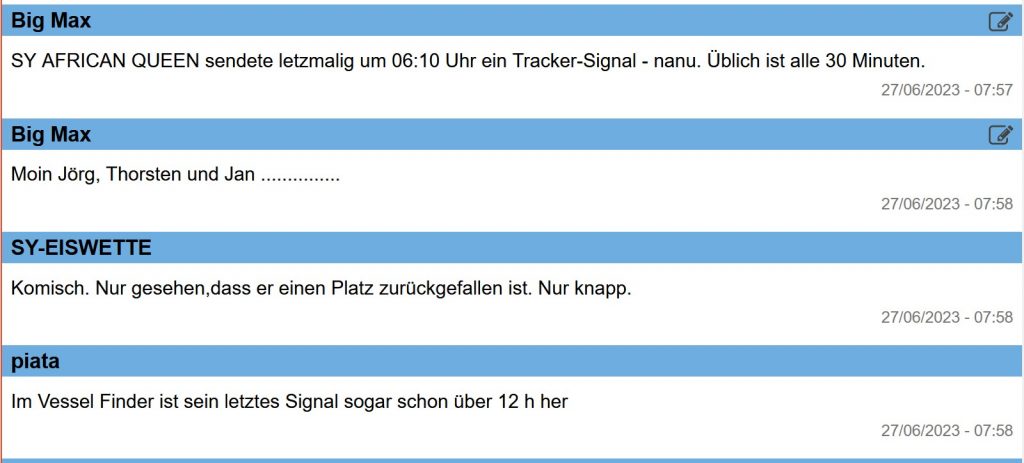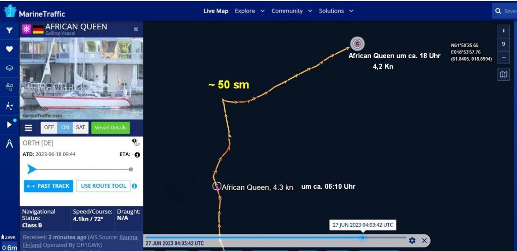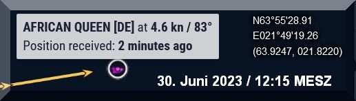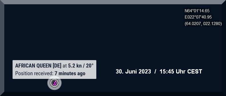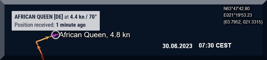07:00 / 07:30 Uhr – Warum sendet die AFRICAN QUEEN kein Tracker-Signal? Letztmalig um 06:10 Uhr.