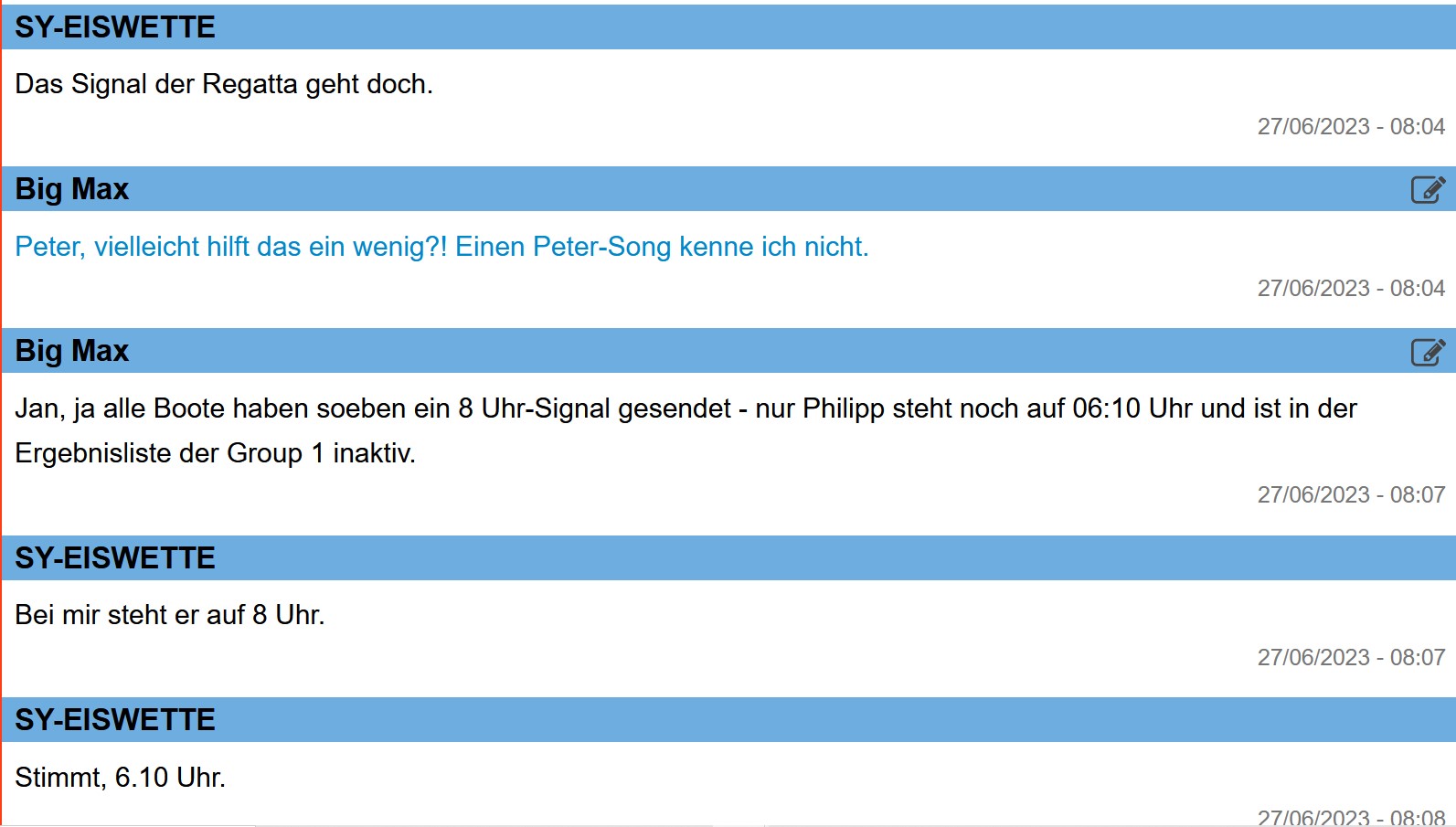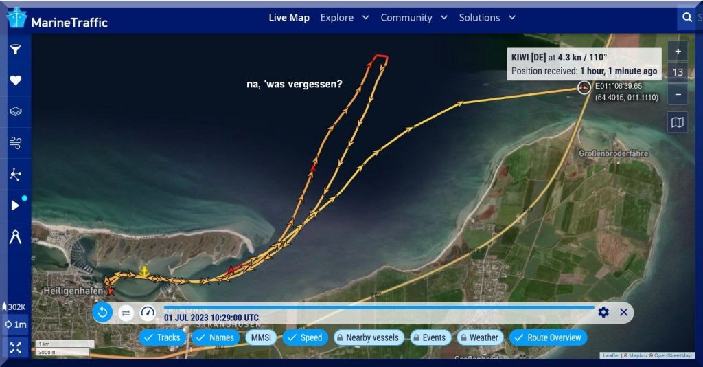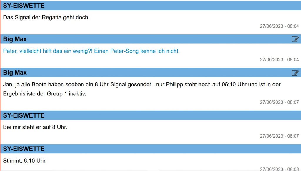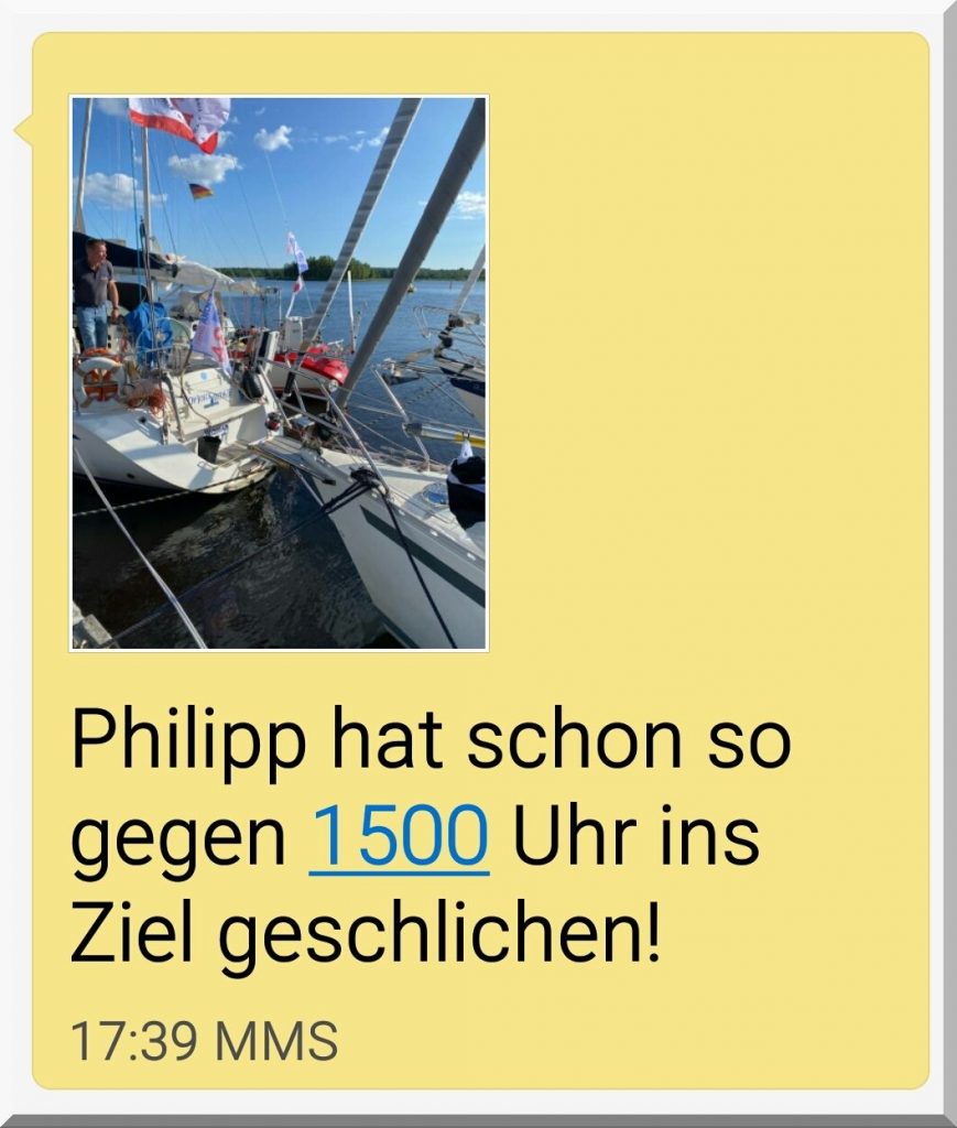 Auch, dass die Regattaleitung nicht manuell in die Ergebnis-App eingreifen kann, finde ich jämmerlich. Einfach mehrfach Philipp per Mobilfunk anrufen und sich seine Koordinaten durchgeben lassen und anschließend in die App eingeben.