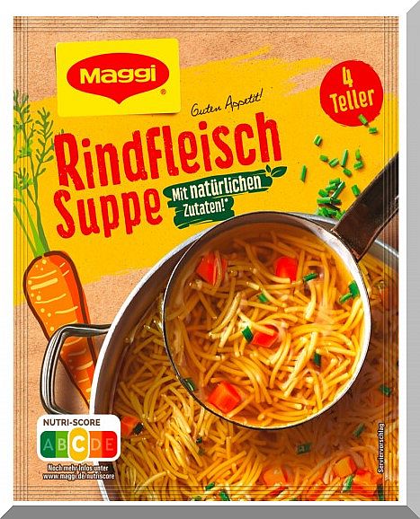 Wir etscheiden uns für eine Maggi Rindfleisch-Suppe mit Fadennudeln.