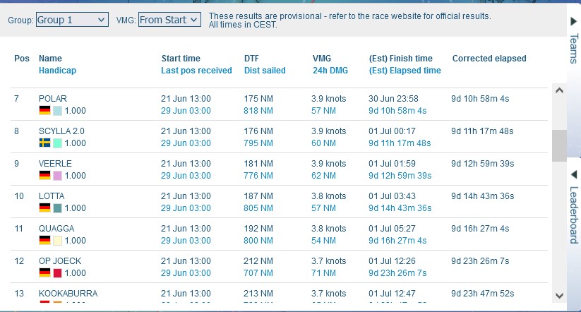 09:30 Uhr – Philipp hat sich seinen 9. Platz zurück erobert. KOOKABURRA holt wieder auf und ist auf Platz 11.