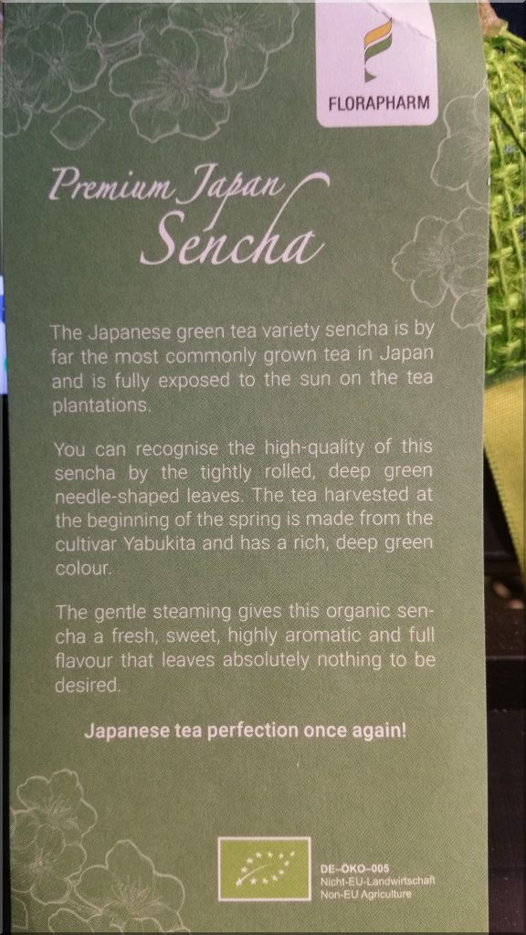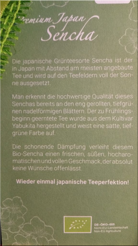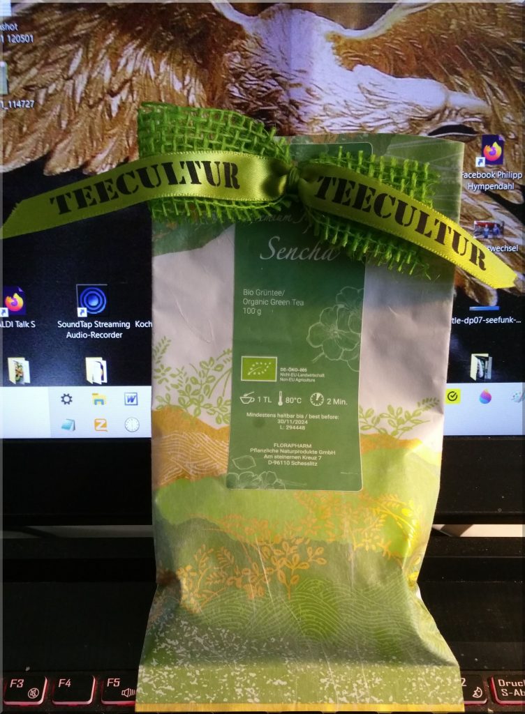 Dieser Tage hatte ich wieder bei Teecultur in Neckarsulm unsere Grünteesorten bestellt, die 2 Tage später schon bei uns waren, wie immer. Als Präsent lag diesmal eine 100g-Tüte Premium Sencha aus Japan dabei, den wir sofort beim Frühstück probiert haben. Ich kann nur sagen, ein Hochgenuss – danke Frau Leinmueller: