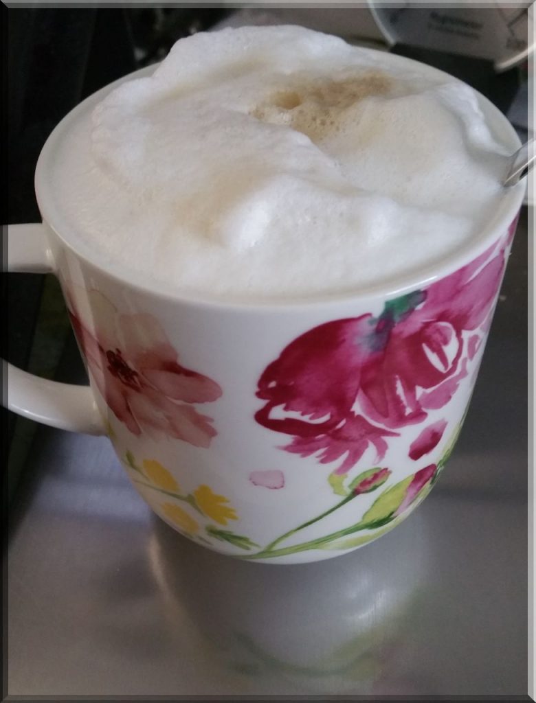Die Tasse faßt 1/3 Liter. Ich fülle sie halb voll mit laktosefreier 3,5 % Milch und schäume sie kräftig auf.
