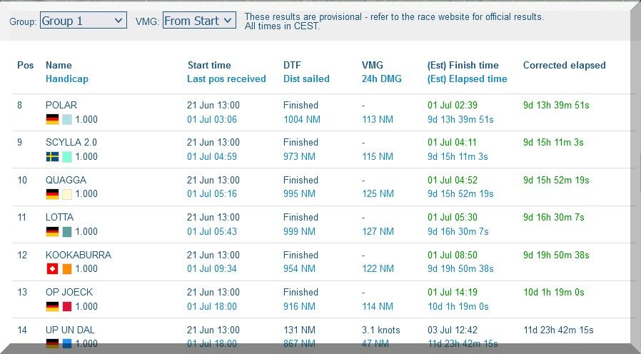 Philipp, ich gratuliere Dir sehr herzlich, dass Du wohlbehalten ins Ziel gekommen bist und Du Dich nun erst einmal richtig ausschlafen kannst. Rd. 900 Seemeilen einhand zu absolvieren ist schon eine hervorragende Leistung und mit der Platzierung in Gruppe 1 kannst Du doch auch recht zufrieden sein, wenngleich man sich in jeder Regatta wünscht, mit in der Führungsspitze einer Gruppe die Regatta zu beenden.