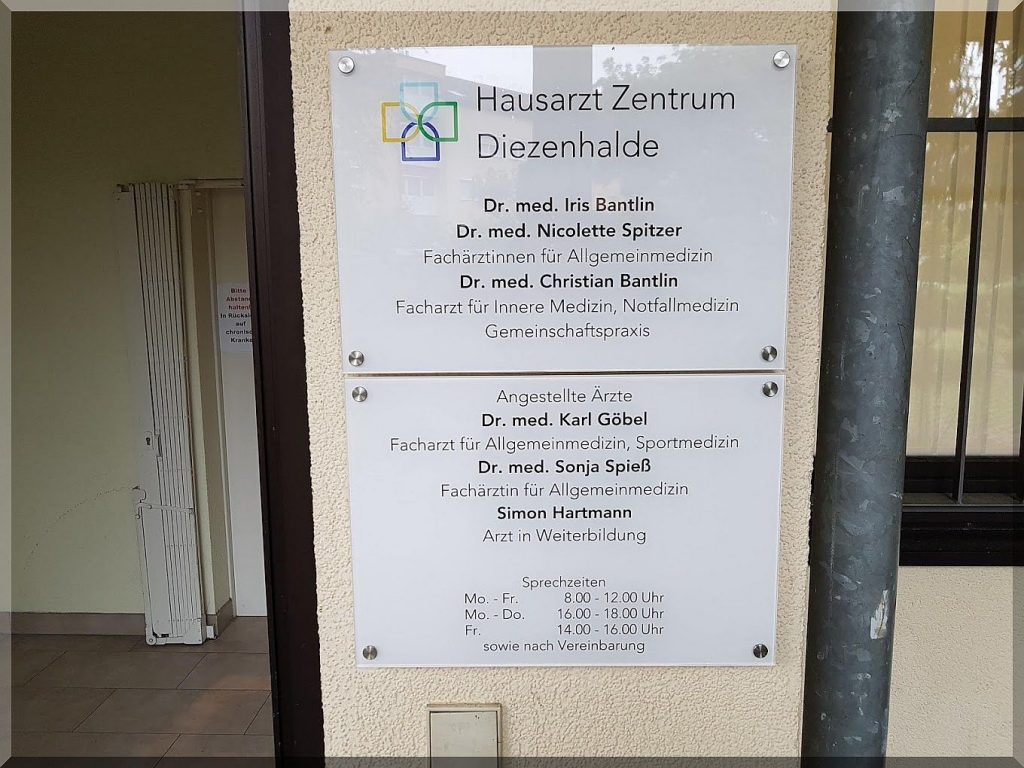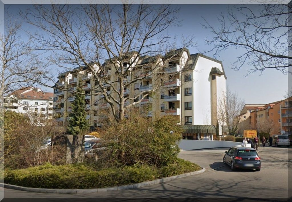 ….. rechts auf der Rückseite dieses Wohngebäudes befindet sich meine Hausarztpraxis in der 2. Etage (mit Fahrstuhl, aber den ignoriere ich) und vorne links im Erdgeschoss der Bäcker – hinter der Tanne.