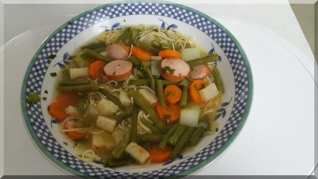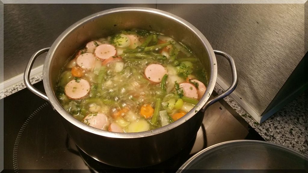 Zutaten: 1 Ltr. instant Gemüsebrühe, 500 g grüne Bohnen, 1 Kohlrabi, 3 Möhren, 1 kl. Sellerie, 1 Lauch, (2 rote Zwiebeln) und 1 rote Wurst von gestern in Scheiben, einen ordentlichen Klecks Butter (so, wie Herr Lichter das früher immer als Koch empfohlen hatte) oder 100 ml Sahne, Petersilie, Pfeffer, Salz u. Knoblauch nach Belieben.