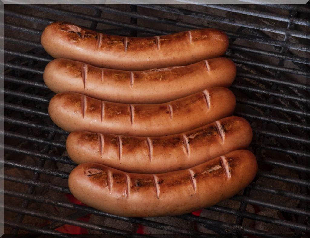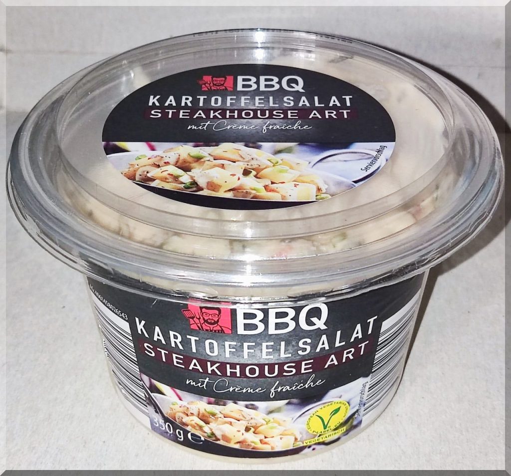 Rote Wurst als Currywurst zubereitet, mit den üblichen Gewürzen (Rosenpaprika u. Curry), Ketchup, Ajvar scharf und BBQ-Kartoffelsalat.