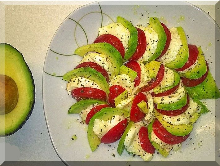 17:30 – Zum Abendessen gab es Avocado mit Tomate und Mozzarella nebst Olivenöl, Balsamico und Mozzarella-Salz: