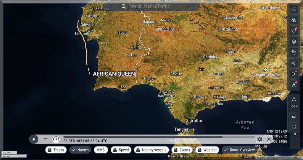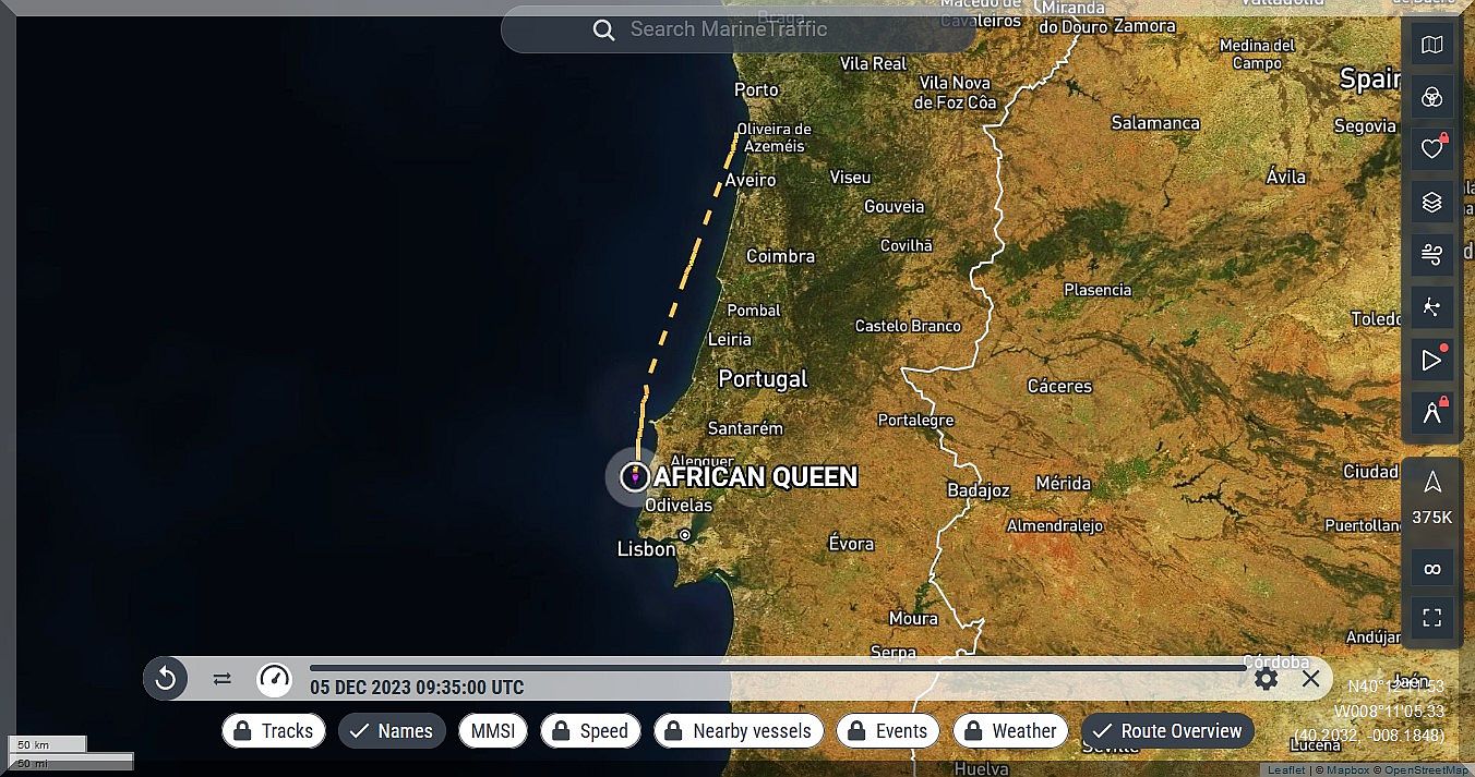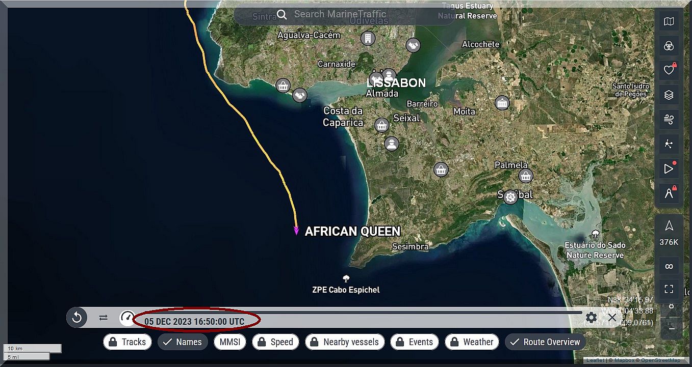 Um 17:50 Uhr MEZ = 16:50 Uhr UTC ist Philipp bereits an Lissabon vorbeigefahren. Mal sehen, wo er morgen früh sein wird?