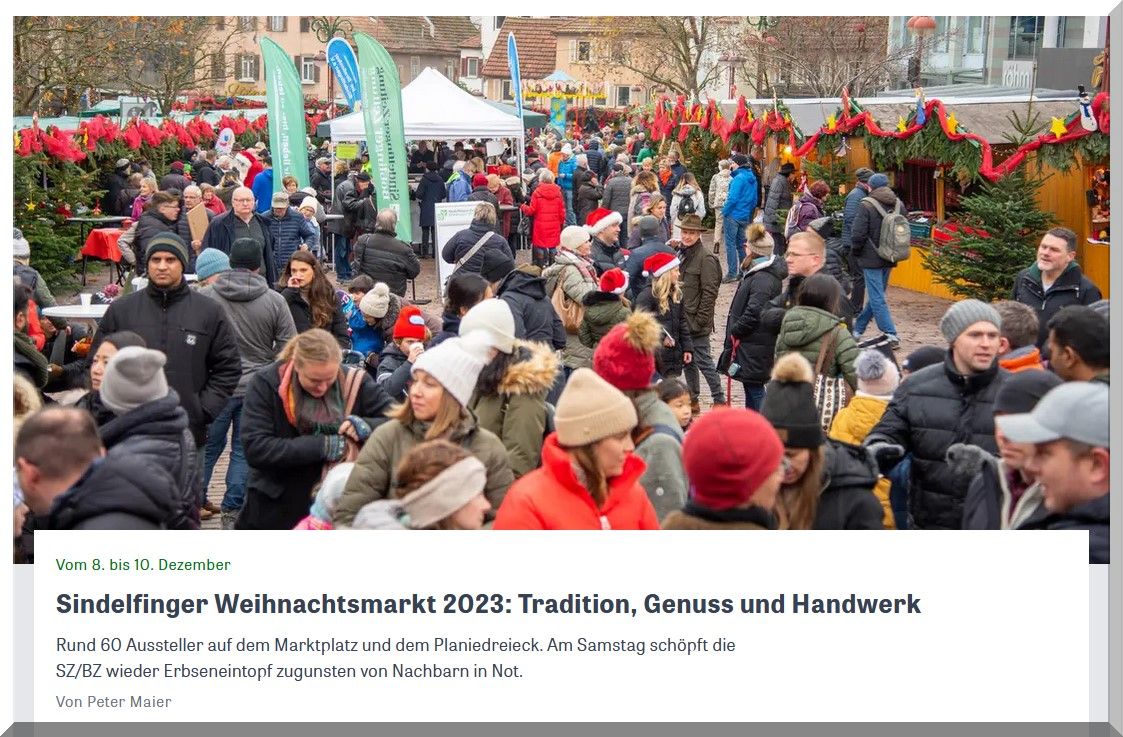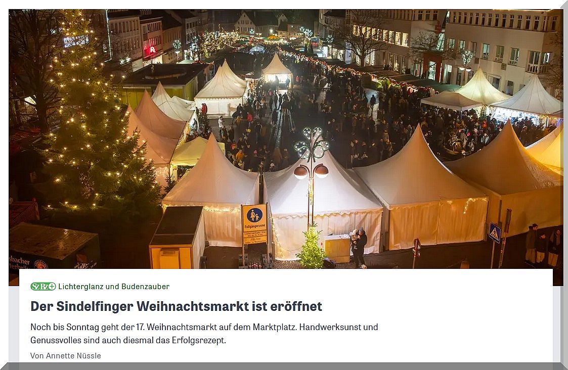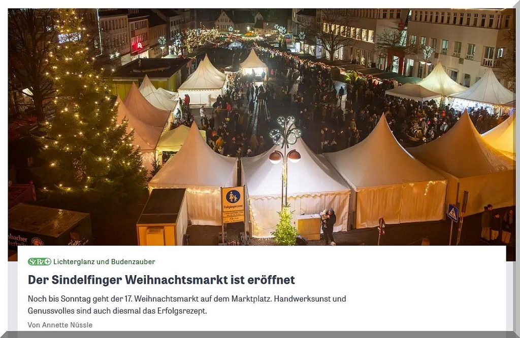 Am Freitag, 8. Dezember von 18 bis 22 Uhr, Samstag, 9. Dezember von 11 bis 22 Uhr und Sonntag, 10. Dezember, von 11 bis 19 Uhr lädt der festlich dekorierte Sindelfinger Marktplatz mit seinen ebenso festlich dekorierten Weihnachtshütten und –zelten zum Besuch ein.