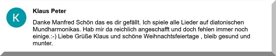 Du bist ja unheimlich fleißig – toll! Bereitest Du Dich gerade auf eine Welttournee vor? Schön, daß Du Dir ein so schönes Hobby erarbeitet hast. Obendrein ist eine Mundharmonika ein Instrument, das man immer bei sich haben und spontan Freude bereiten kann.