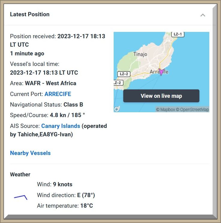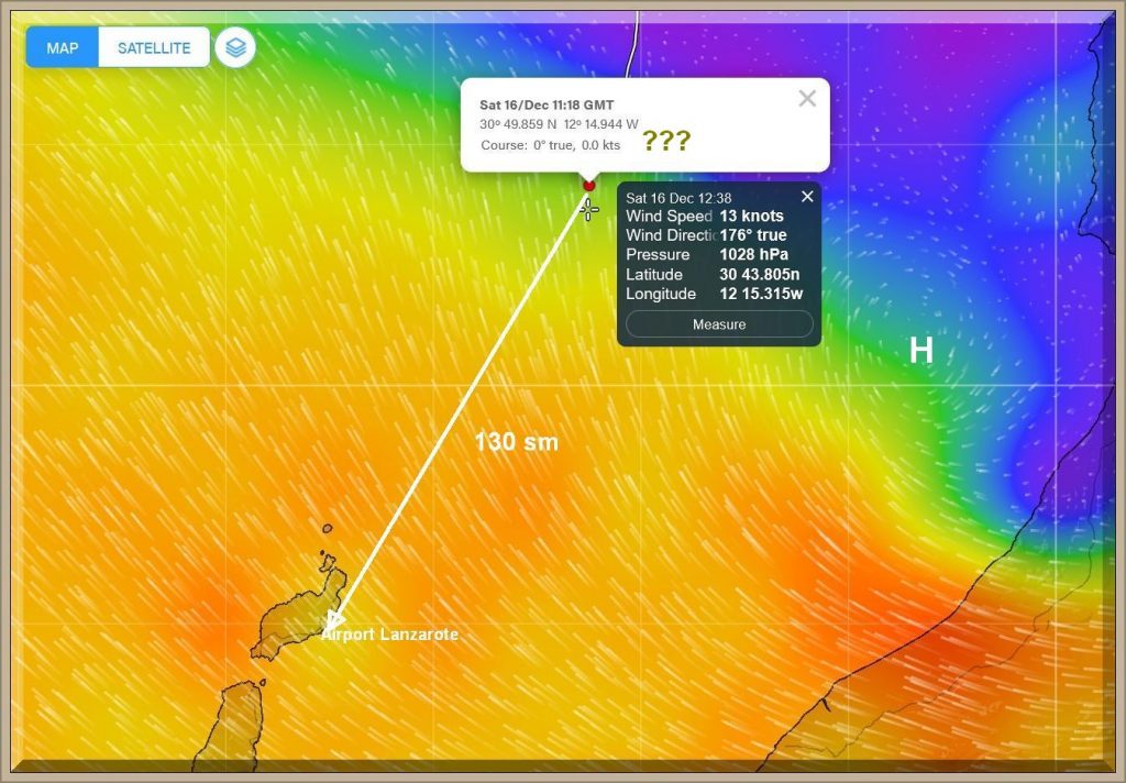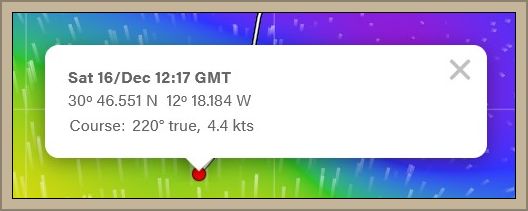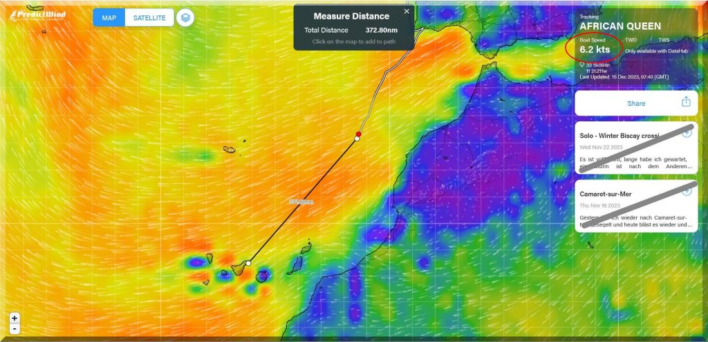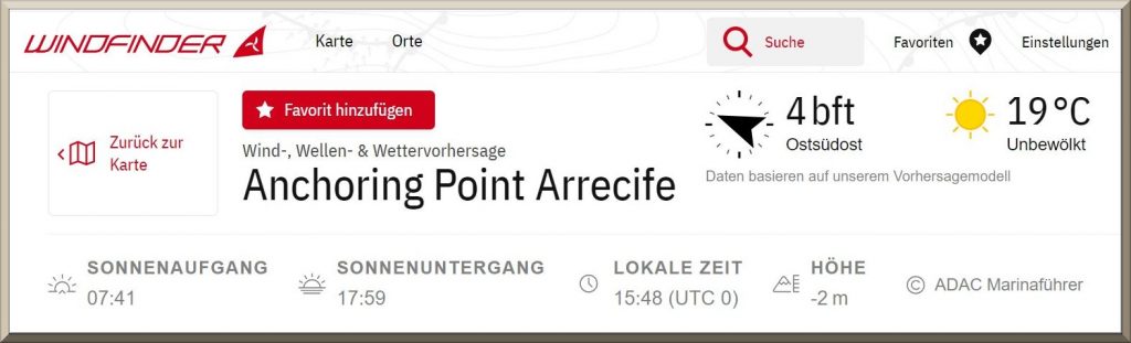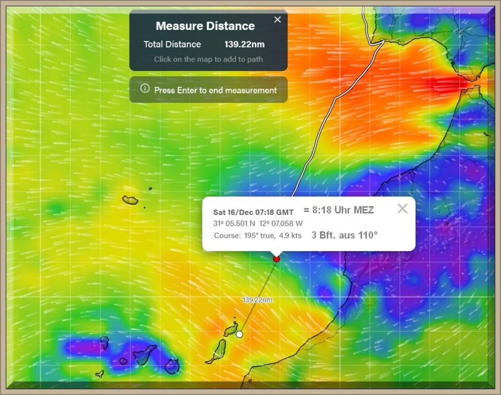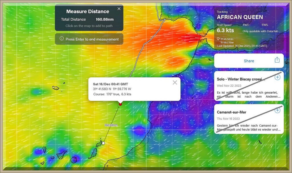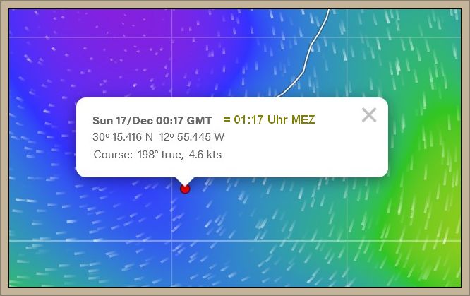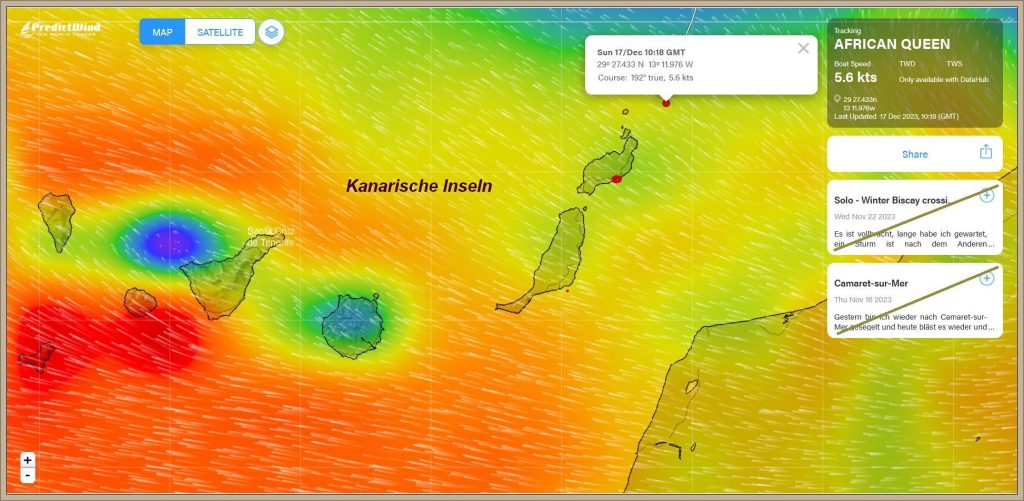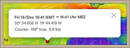 10:18 Uhr UTC/GMT = 11:18 Uhr MEZ – Bei Philipp läuft’s wieder – 5.6 Kn Speed und Halbwindkurs bei 4 Bft. aus SE – nur noch rd. 40 sm bis zum Zielhafen auf Lanzarote.