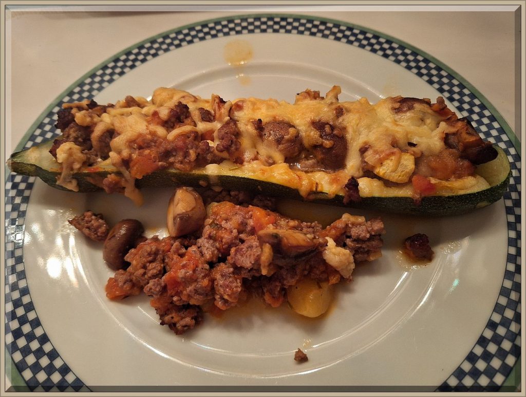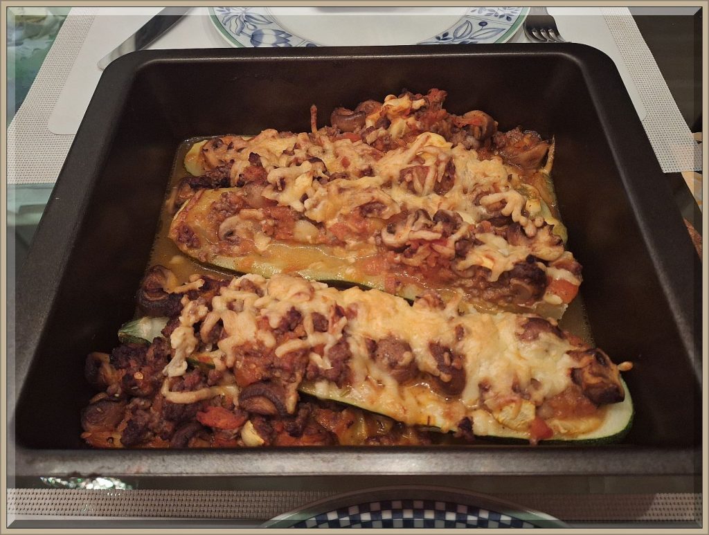 Gefüllte Zucchinihälften mit Käse überbacken. Zutaten: Hackfleisch als Sauce Hachée gebraten, gebratene Champignons, und 1 gewürfelte Zwiebel gebraten. Tomatensoße selber gemacht. Knoblauch, Salz, Pfeffer, Rosmarin, Thymian und ein Schuß Sahne. Keine Sättigungsbeilage erforderlich.