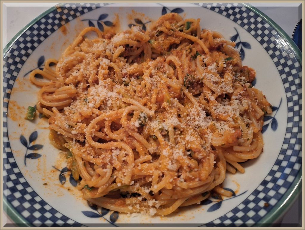 Zutaten: 2 kleine Dosen STAR Gran Ragù, 200 g Spaghetti + 1 Zucchino Julienne, 2 Prisen Chili, Salz u. Pfeffer, 1 kräftiger Schuß Sahne, Petersilie, geriebener Parmesan-Käse obenauf: