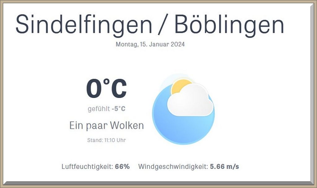 10:30 Uhr – Es regnet kräftig – es ist wohl Vorsicht beim Autofahren geboten, da überfrierende Nässe auftreten kann.