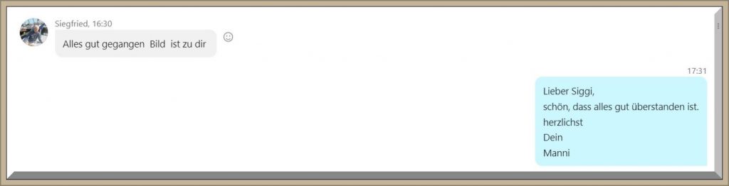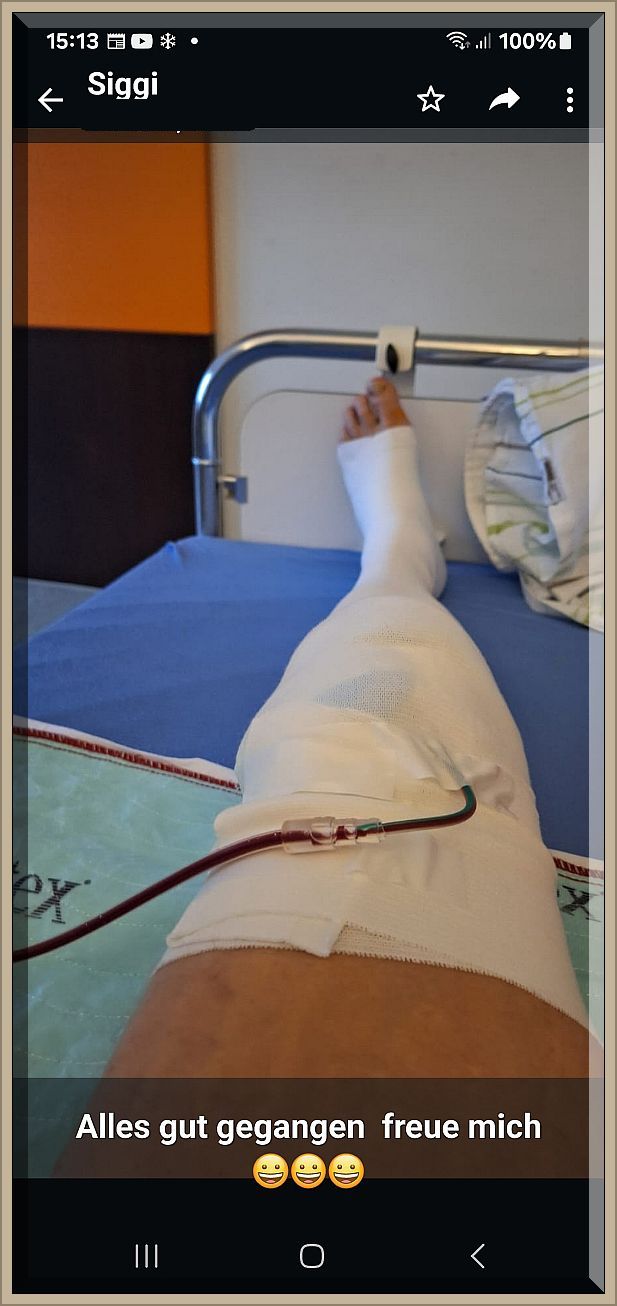10:30 Uhr – Kurzes Telefonat mit Siggi in der Klinik geführt. Der Große Verband ist schon entfernt. Sein Knie ‚ziert‘ nur noch ein großes Pflaster – die Drainage ist auch schon entfernt worden. Vielleicht wird er am Samstag schon entlassen.