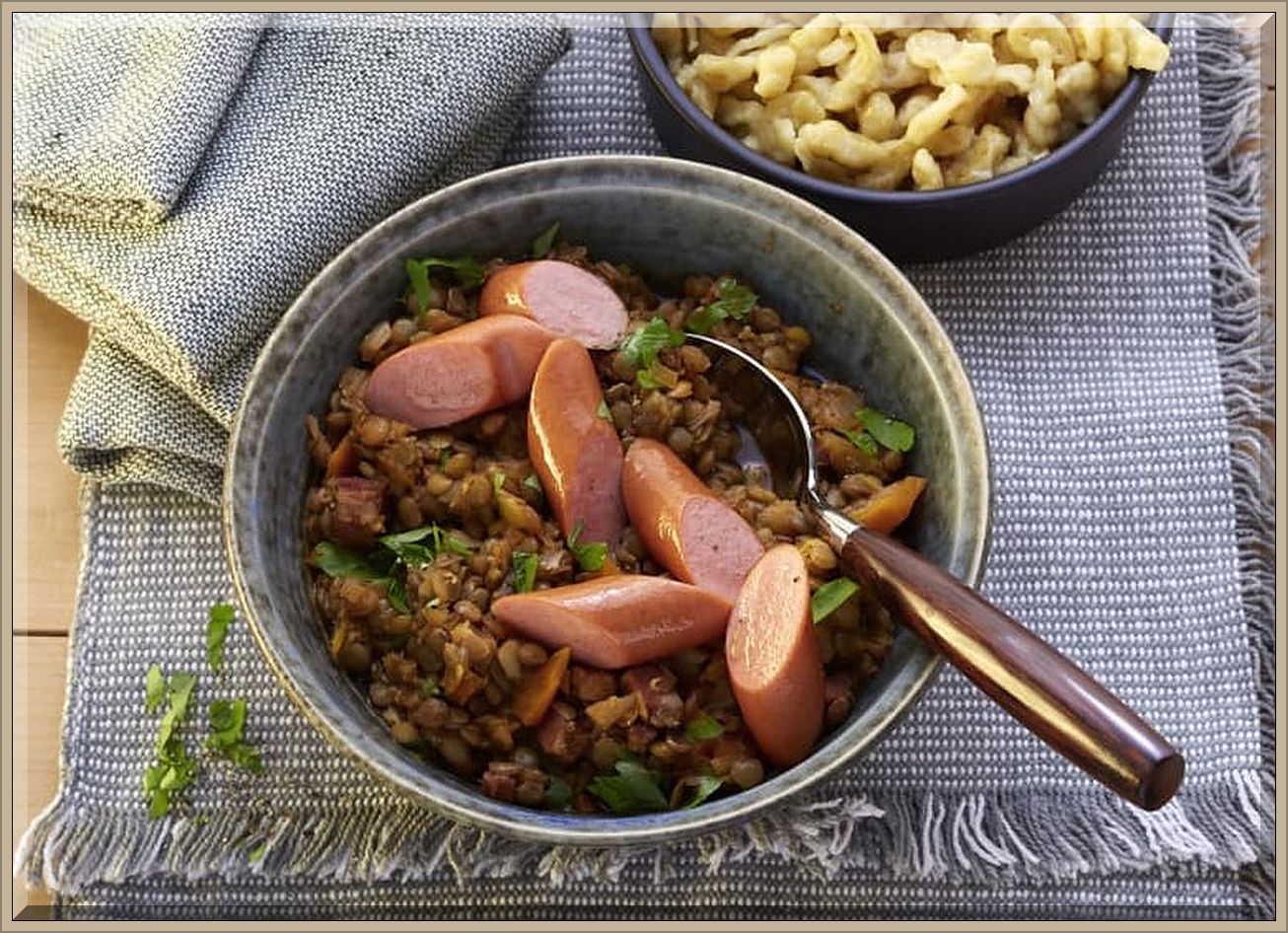 17 Uhr – Zum Abendessen gab es mit Lauchzwiebeln und Möhren gepimte Linsen mit Wiener Würstchen in feinen Scheiben, Condimento Bianco, Petersilie und Spätzle.