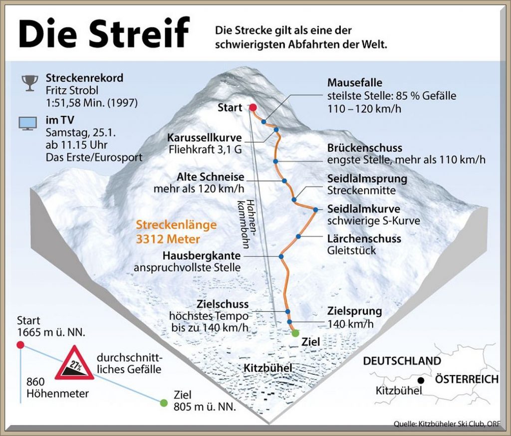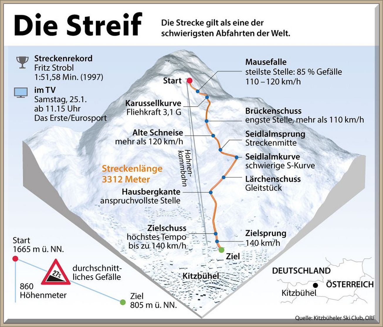 Für Boris Becker lag der Fall klar. „Meines Erachtens sind die alle ein bisschen lebensmüde“, sagte die Tennislegende einmal über die verrückten Fahrer, die sich Jahr für Jahr die berühmt-berüchtigte Abfahrt in Kitzbühel hinunterstürzen. Die Streif, das sind 3312 Meter in Schnee und Eis gehauener Irrsinn, das ist auch eine Piste als Angriff auf die Gesundheit der Teilnehmer.