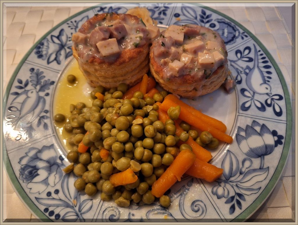 17 Uhr – Zum Abendessen bereiten wir uns gerade Königinnen-Pasteten mit einem Ragout fin und Erbsen/Möhrengemüse zu.