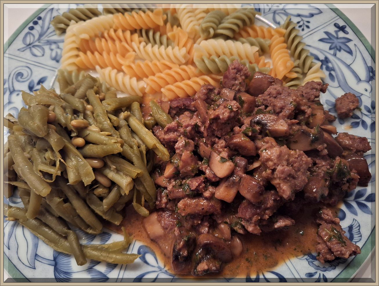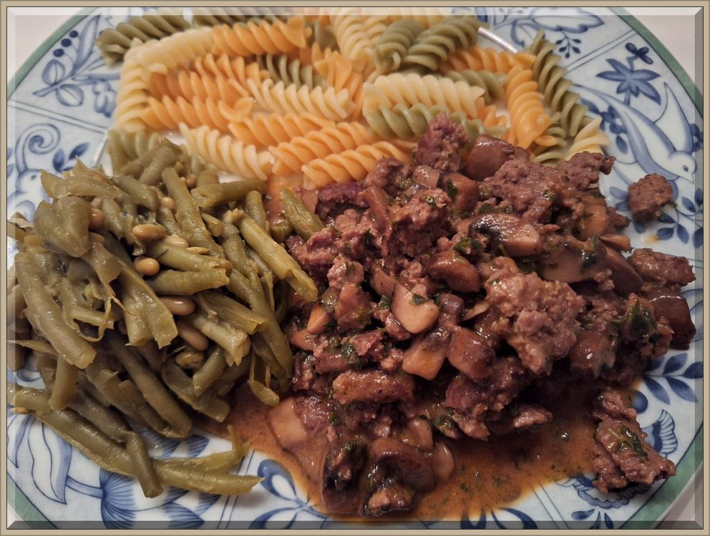 18:30 Uhr Abendessen: Rinderhaschee mit Champignons, grünen Bohnen und bunten Spirellis: