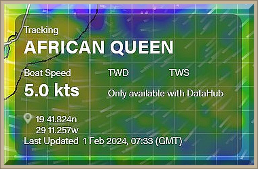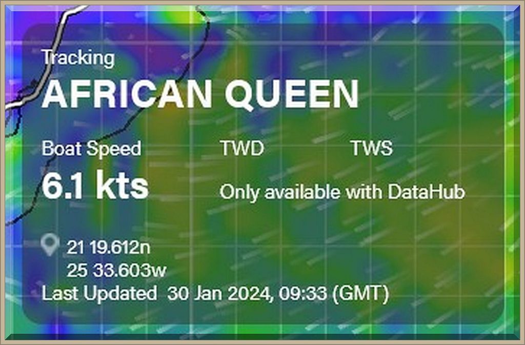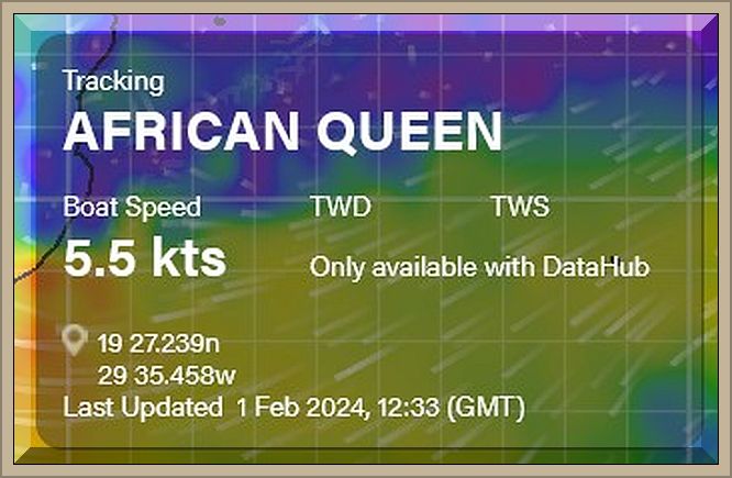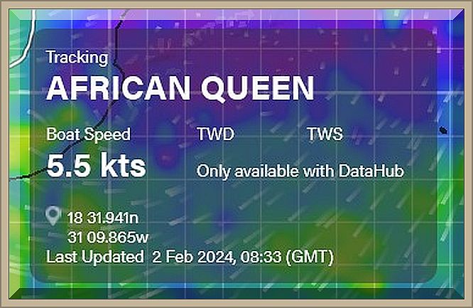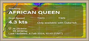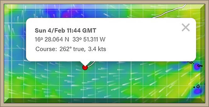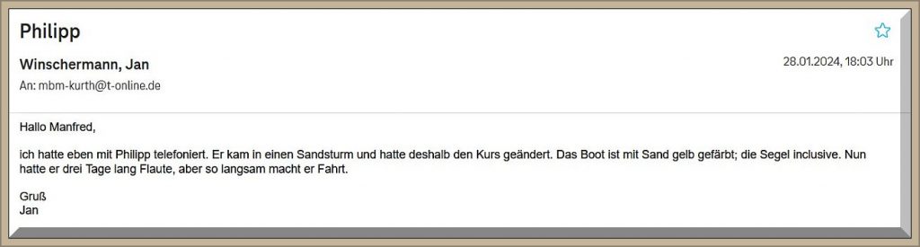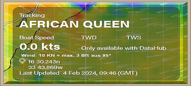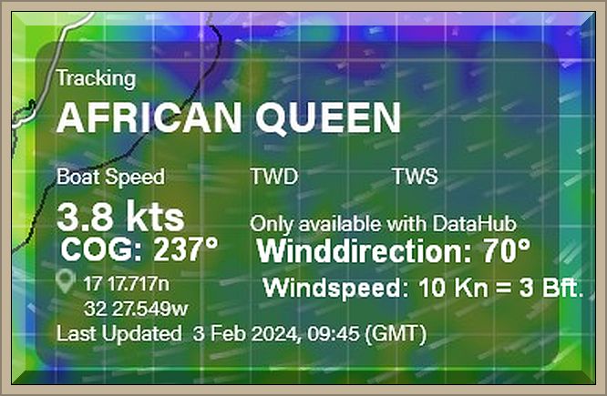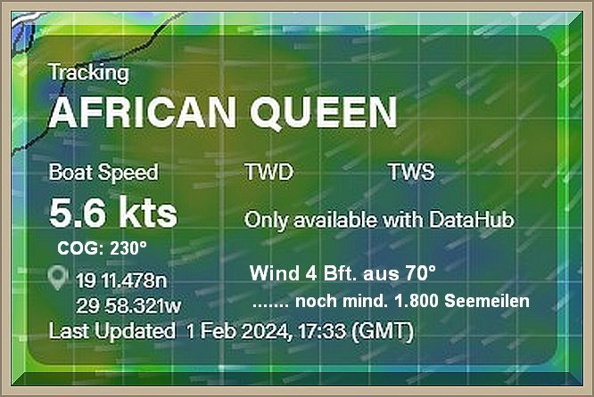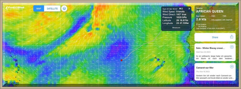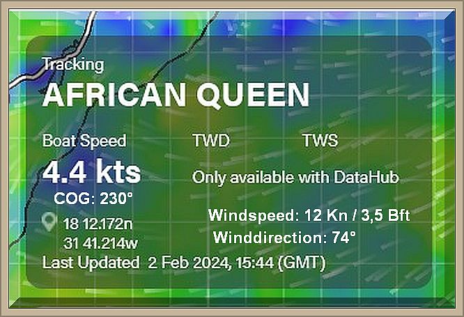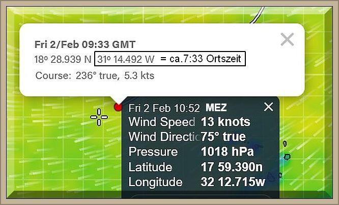 17:33 Uhr GMT – Philipp kommt allmählich in den Passatwind hinein. Bei 3 bis 4 Bft. aus NE klettert das Speedometer langsam auf 5 Knoten Speed hinauf.